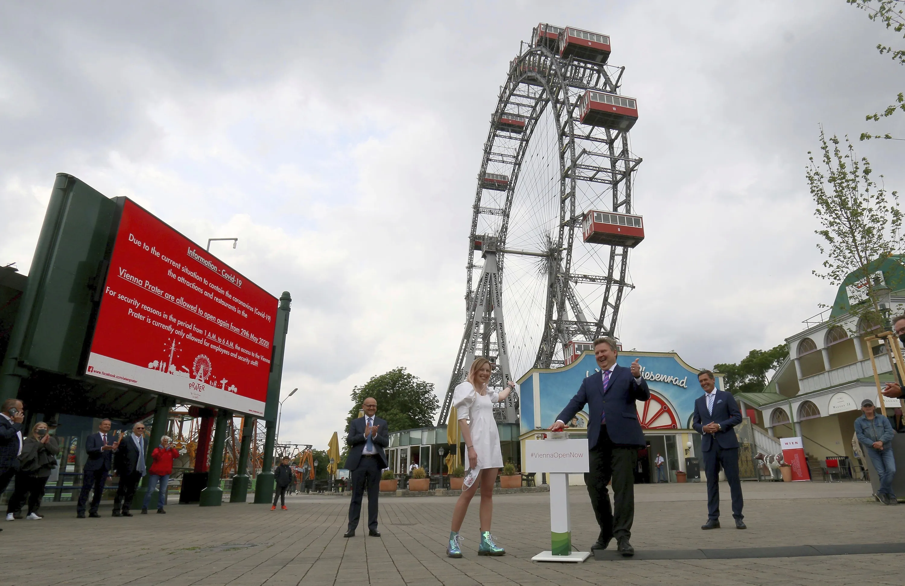 The Mayor of Vienna Michael Ludwig, center, presses a button to restarts the giant Ferris Wheel to symbolically signal the resumption of tourism in Austria in Vienna, Austria, Friday, May 29, 2020. Amusements are open again in Austria as part of relaxing the restrictions to slow the coronavirus and the COVID-19 disease. (Photo by Ronald Zak/AP Photo)