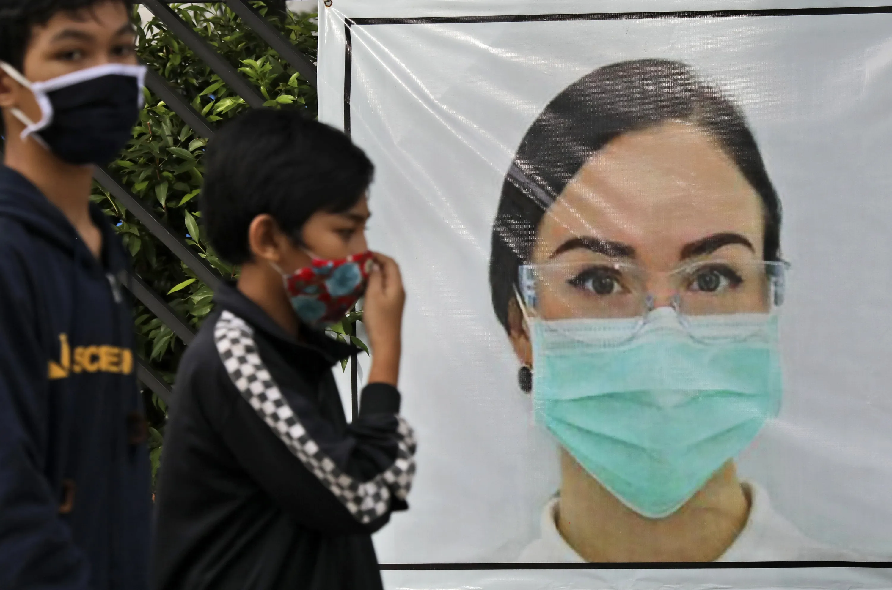 Indonesian youths walk past a banner that calls for people to always wear face mask as a precaution against the new coronavirus outbreak, in Jakarta, Indonesia, Wednesday, May 20, 2020. (Photo by Dita Alangkara/AP Photo)