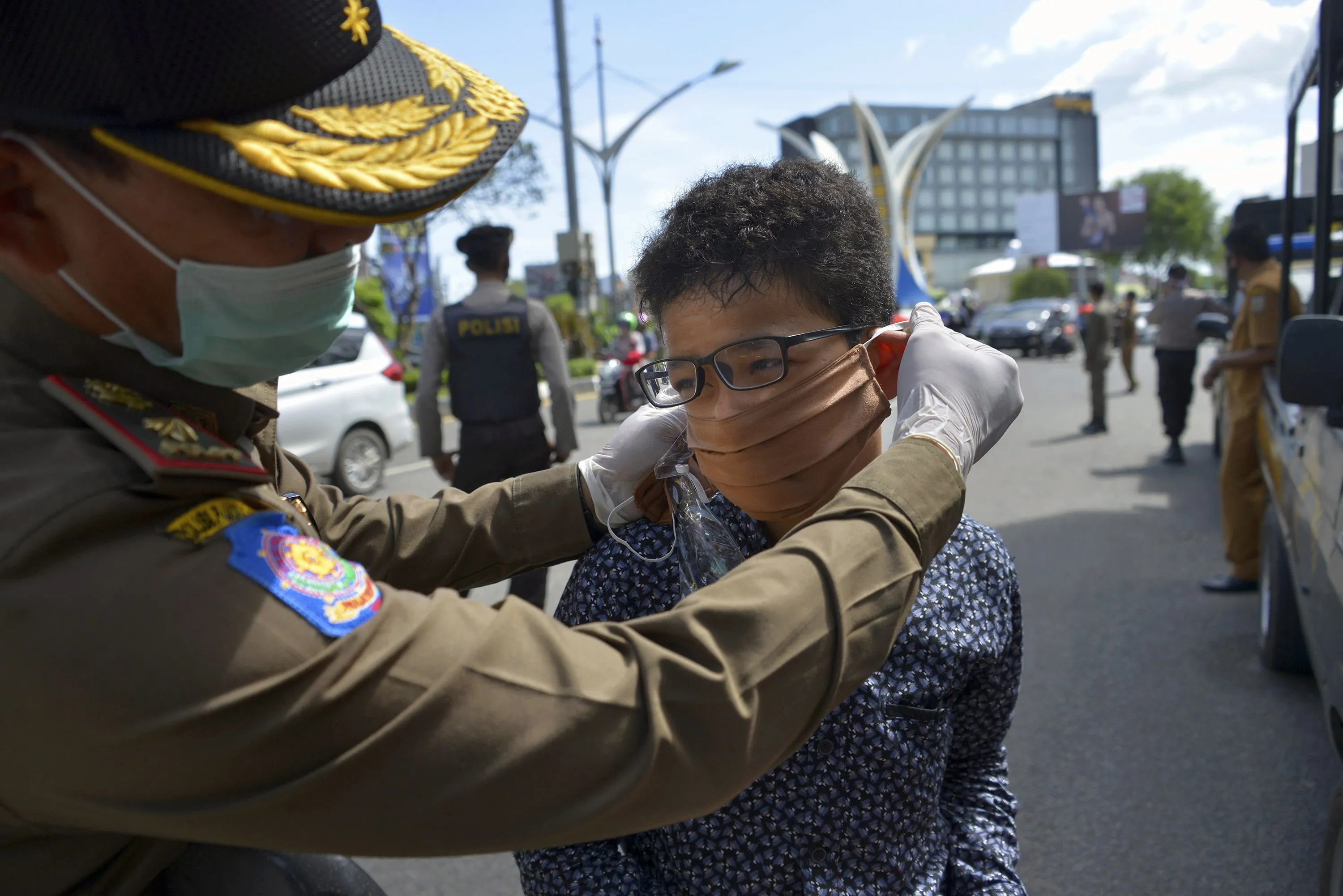A municipal officer adjusts the face mask of a motorist after he was stopped by municipal authorities for not wearing the item amid the COVID-19 coronavirus pandemic in Banda Aceh on May 18, 2020. (Photo by Chaideer Mahyuddin/AFP Photo)