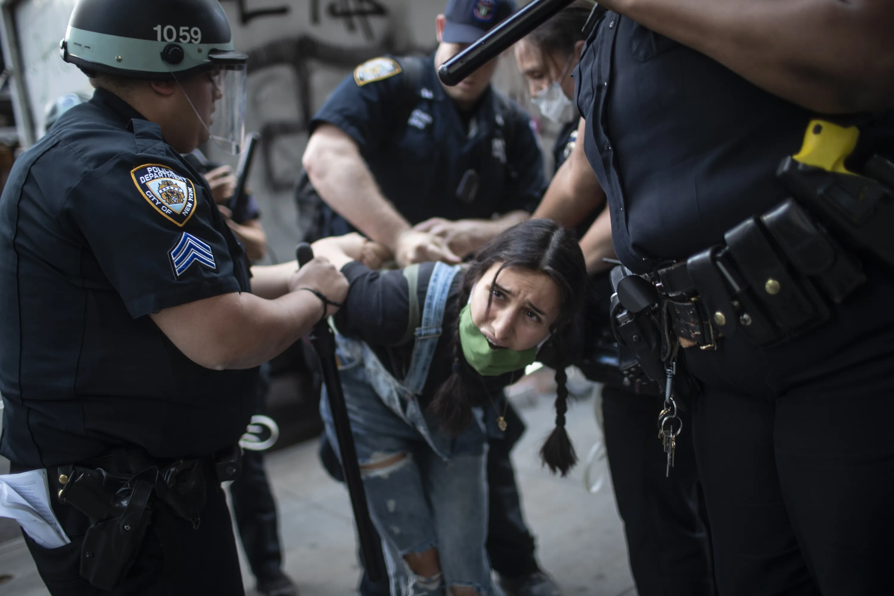 Police detain a protester during a solidarity rally for George Floyd, Saturday, May 30, 2020, in New York. Demonstrators took to the streets of New York City to protest the death of Floyd, a black man who was killed in police custody in Minneapolis on May 25. (Photo by Wong Maye-E/AP Photo)