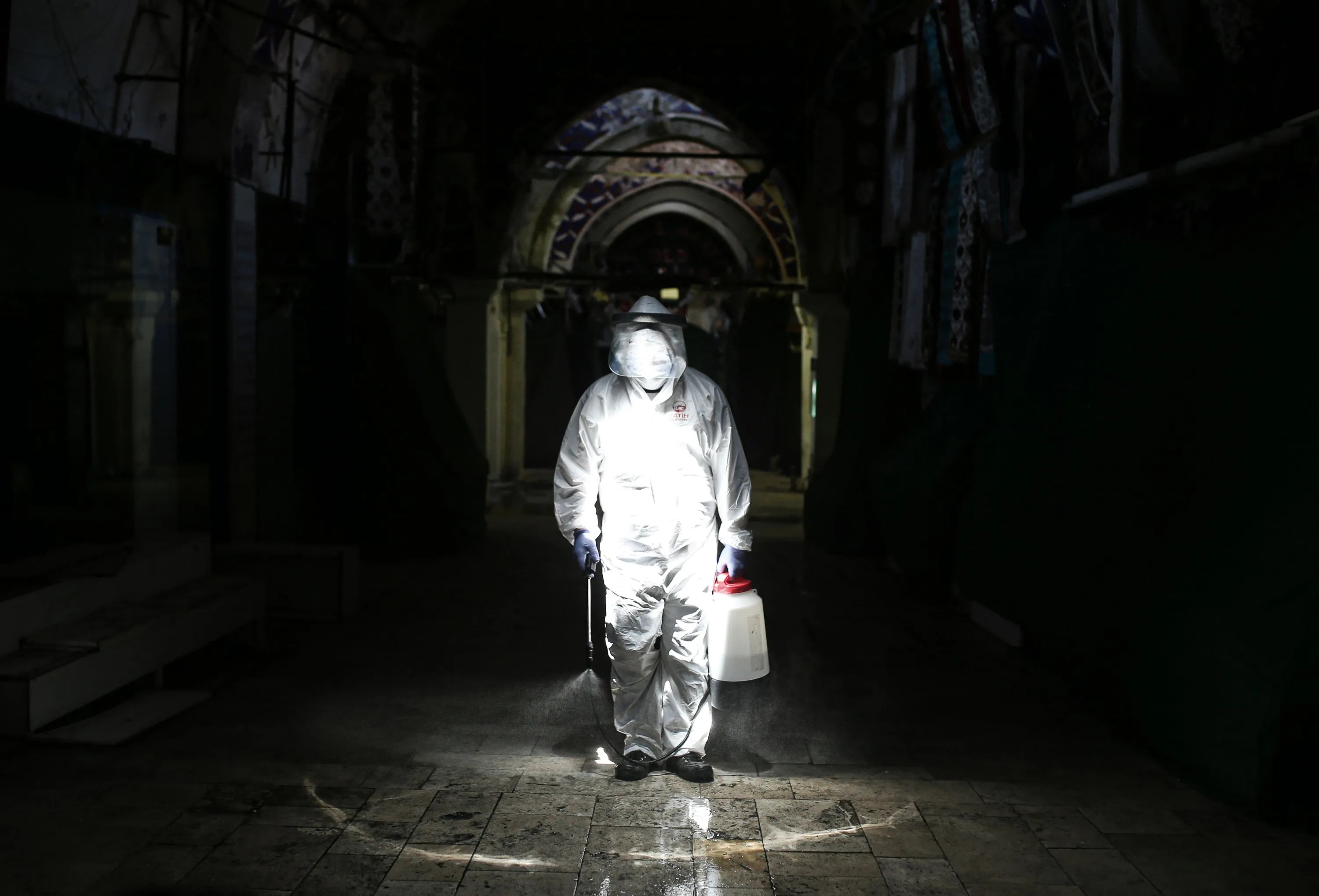 Municipality officials carry out disinfection works at Grand Bazaar, which was closed on March 23 within the coronavirus (Covid-19) measures, ahead of its opening on June 1, in Istanbul, Turkey on May 30, 2020. (Photo by Elif Ozturk/Anadolu Agency via Getty Images)