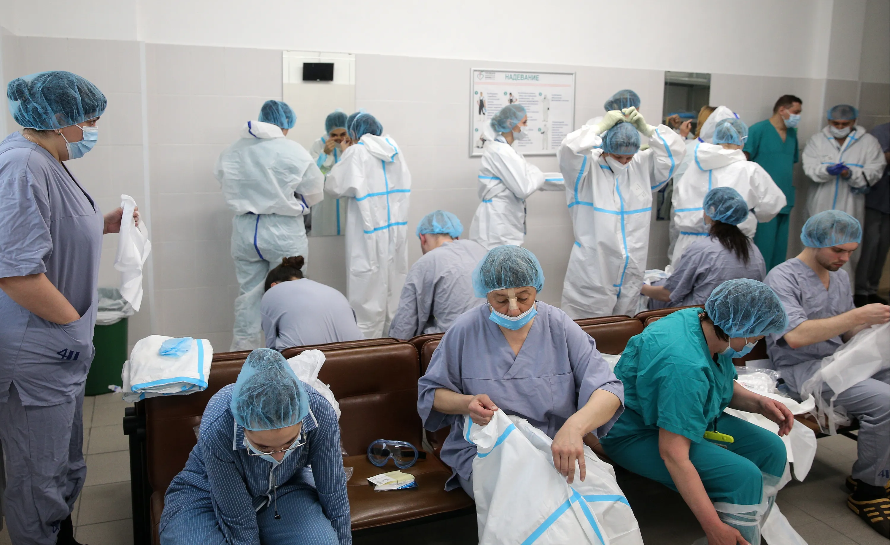 Staff members put on protective suits before entering the “red zone” of a temporary medical facility established for COVID-19 patients at Moscow City Clinical Hospital No 15 (Filatov Hospital) in Moscow, Russia on May 29, 2020. (Photo by Sergei Bobylev/TASS)