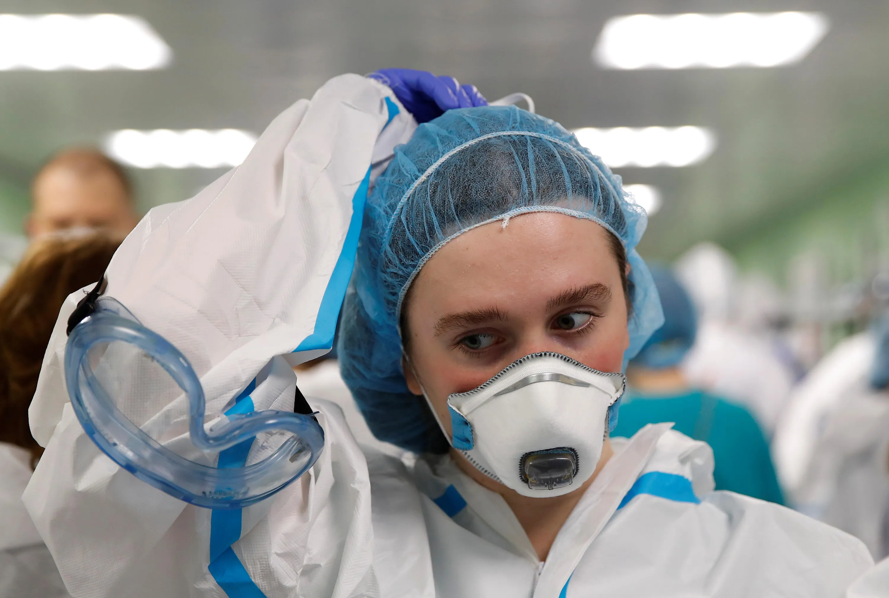 A medical specialist puts on personal protective equipment (PPE) at the City Clinical Hospital Number 15 named after O. Filatov, which delivers treatment to patients infected with the coronavirus disease (COVID-19), in Moscow, Russia on May 25, 2020. (Photo by Maxim Shemetov/Reuters)