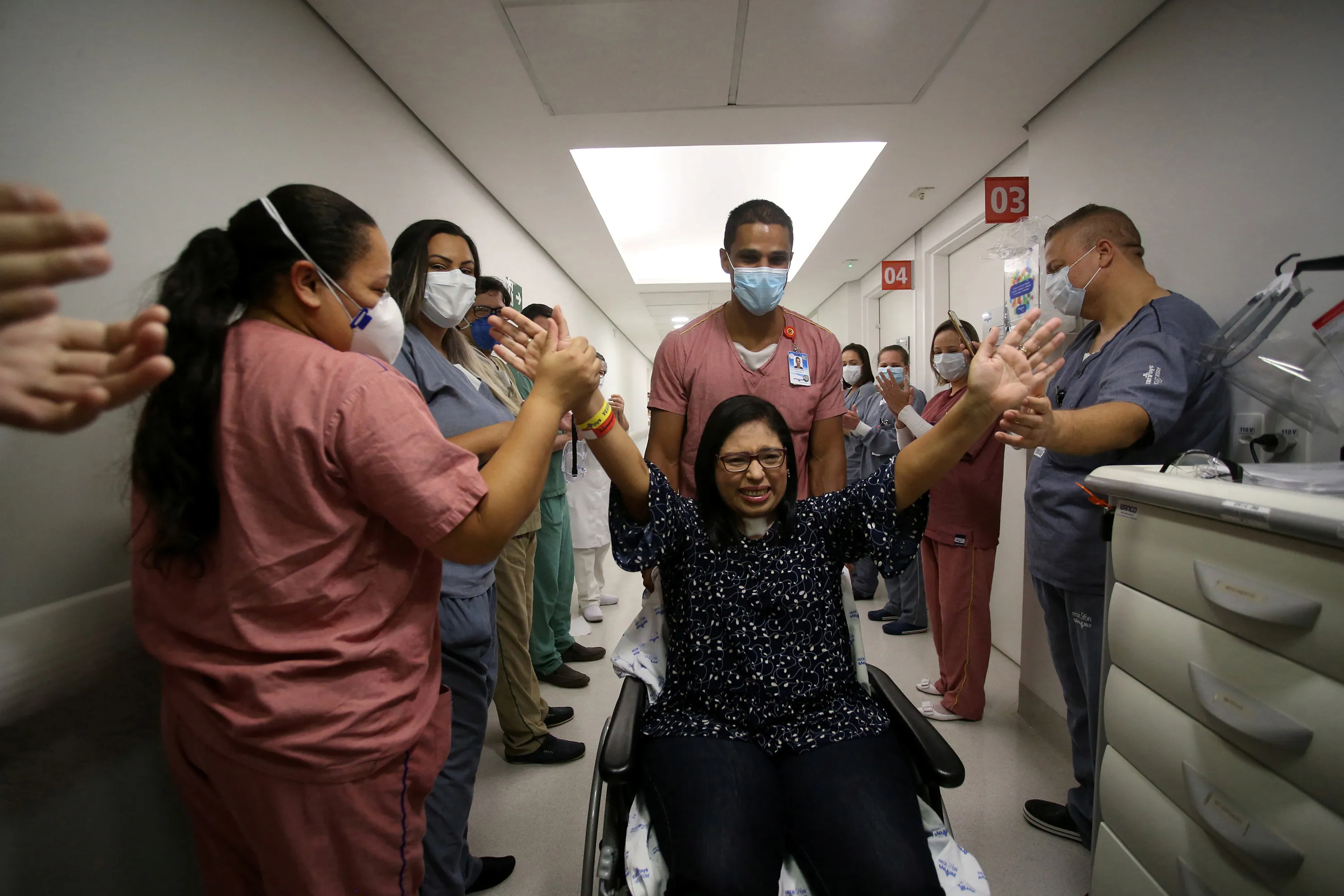 Cassia de Almeida, an ICU nurse of Sao Luiz Hospital, who was hospitalized with severe symptoms of coronavirus disease (COVID-19), waves to her colleagues after being discharged in Sao Paulo, Brazil, May 30, 2020. (Photo by Rahel Patrasso/Reuters)