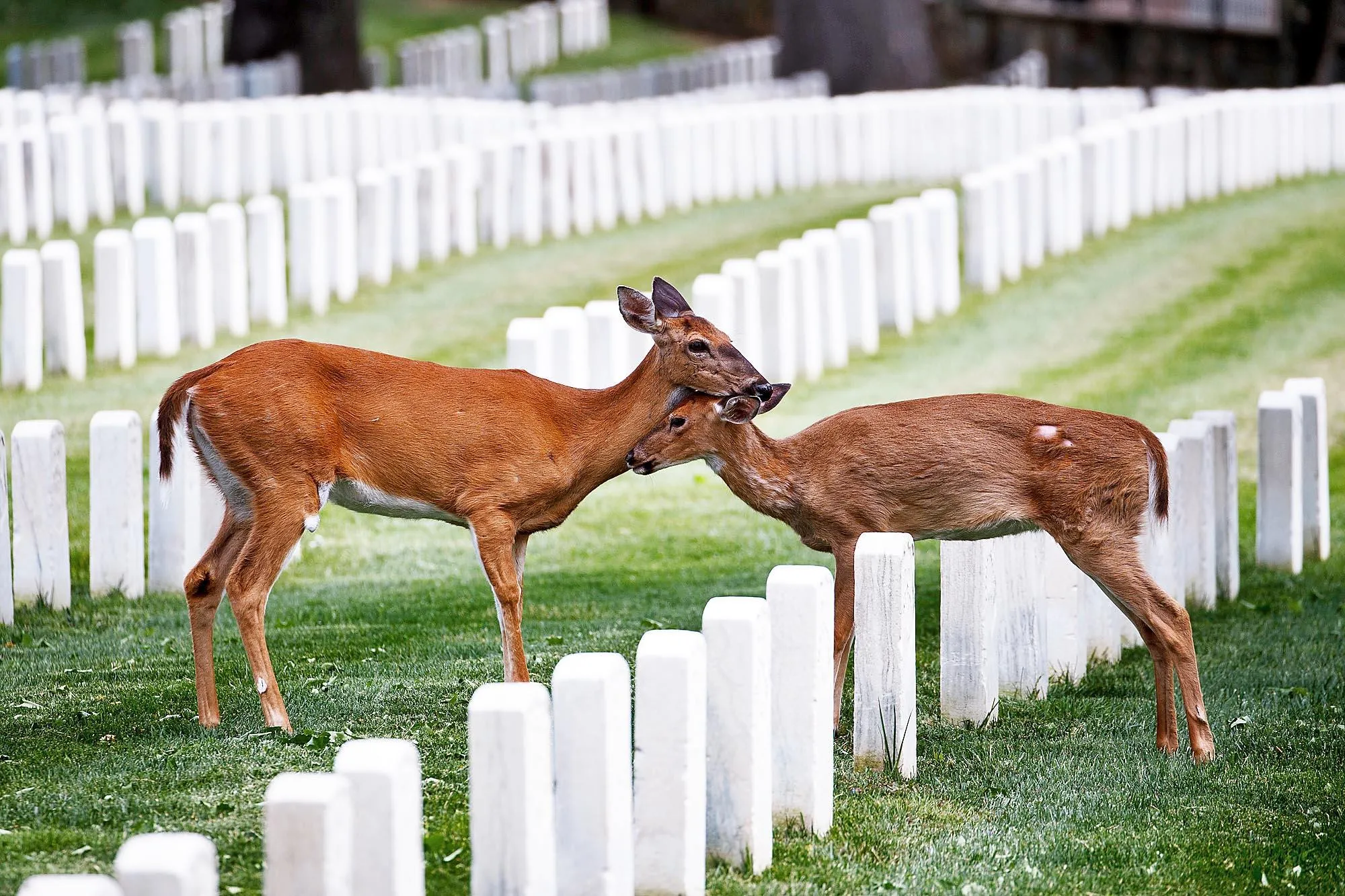 Two deer nuzzle among the headstones at the United States Soldier's and Airmen's Home National Cemetery in Washington, Wednesday, May 20, 2020. The United States Soldier's and Airmen's Home National Cemetery is the oldest national cemetery in the nation. (Photo by Carolyn Kaster/AP Photo)