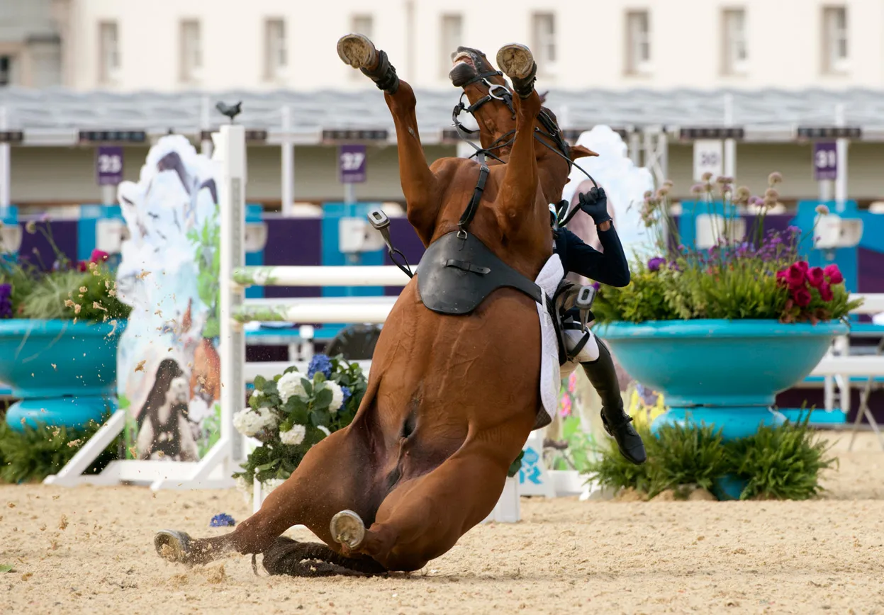 South Korea's Hwang Woojin loses control of his horse during the Show Jumping event of the Modern Pentathlon during the 2012 London Olympics at the Equestrian venue in Greenwich Park, London, on August 11, 2012. (Photo by John MacDougall/AFP)
