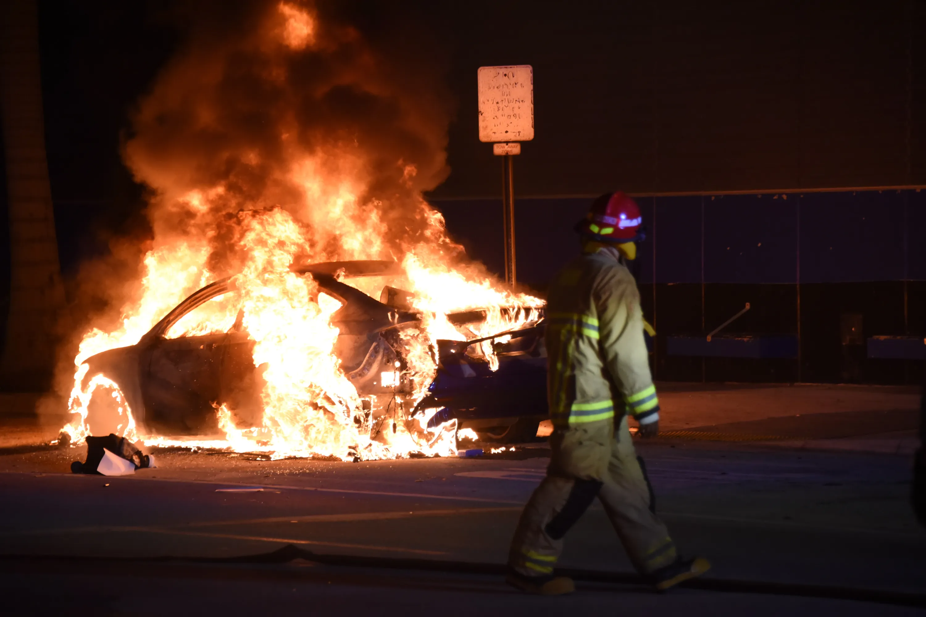 Cars to include police cars set on fire by protestors in Miami, Florida on May 30, 2020. Hundreds of people gather to protest police brutality and the death of George Floyd in Downtown Miami. The protest turns violent as police cars are vandalized, cars set on fire, tear gas is set off and Miami police officers came out in tactical gear. (Photo by Michele Eve Sandberg/Rex Features/Shutterstock)
