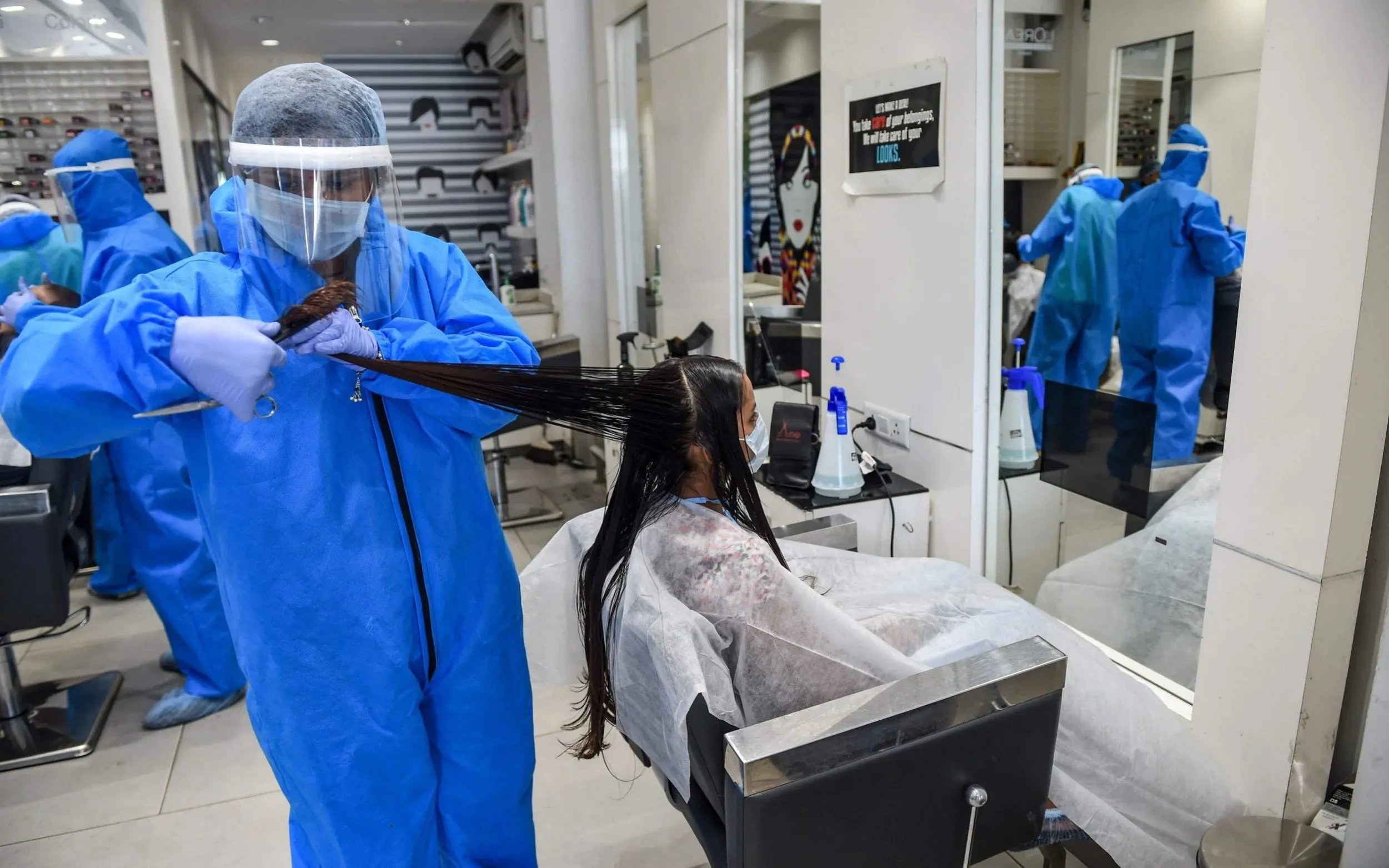 A worker wearing protective gear (L) as a precautionary measure against the COVID-19 coronavirus attends a customer at a hair and beauty salon located in an area declared as green zone for the pandemic, in Nadiad some 50 kms from Ahmedabad on May 17, 2020. (Photo by Sam Panthaky/AFP Photo)