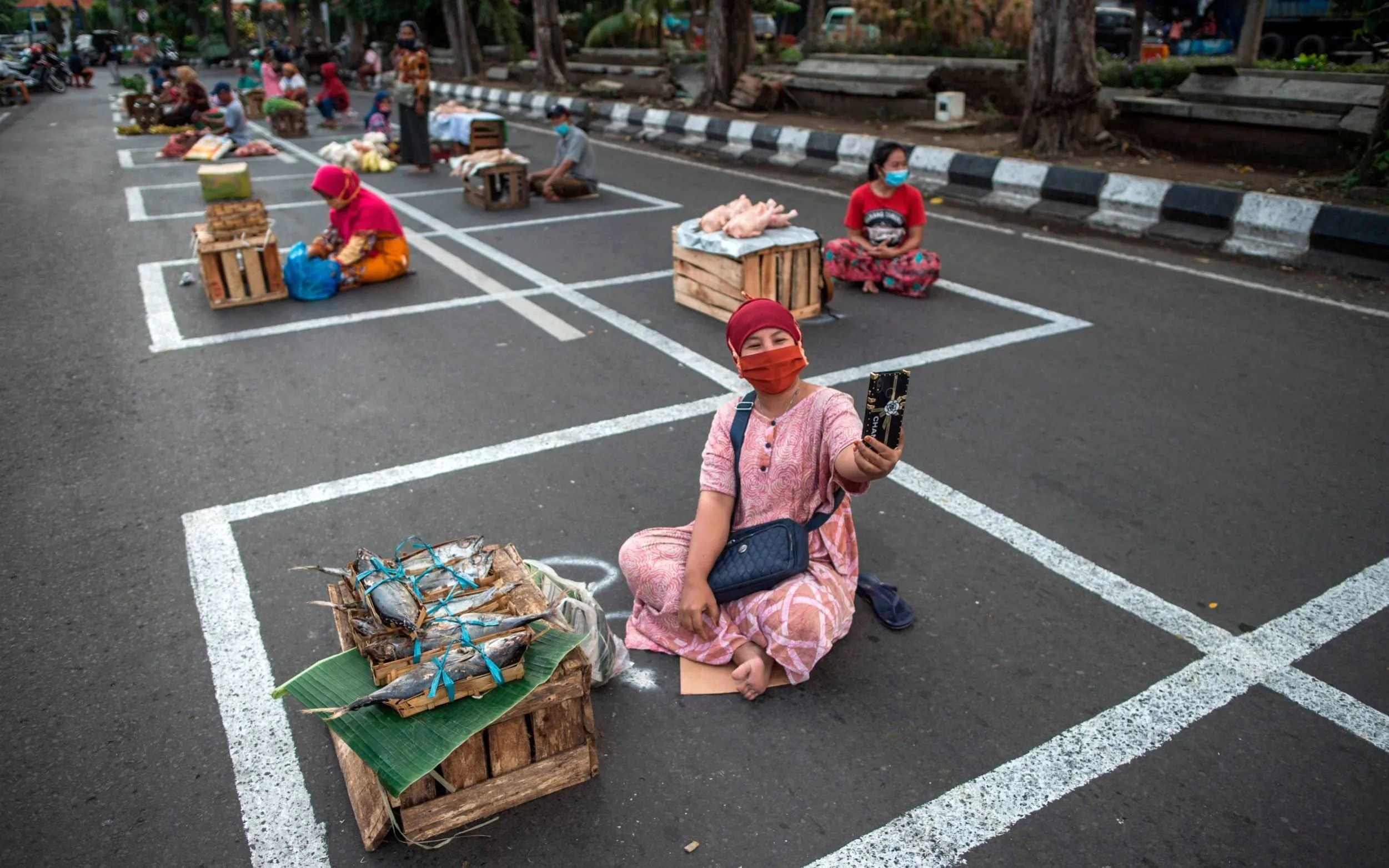 Vendors sit in allocated lots to observe social distancing amid fears over the spread of the COVID-19 coronavirus outbreak along a street in Surabaya, Indonesia in June 2, 2020. (Photo by Juni Kriswanto/AFP Photo)