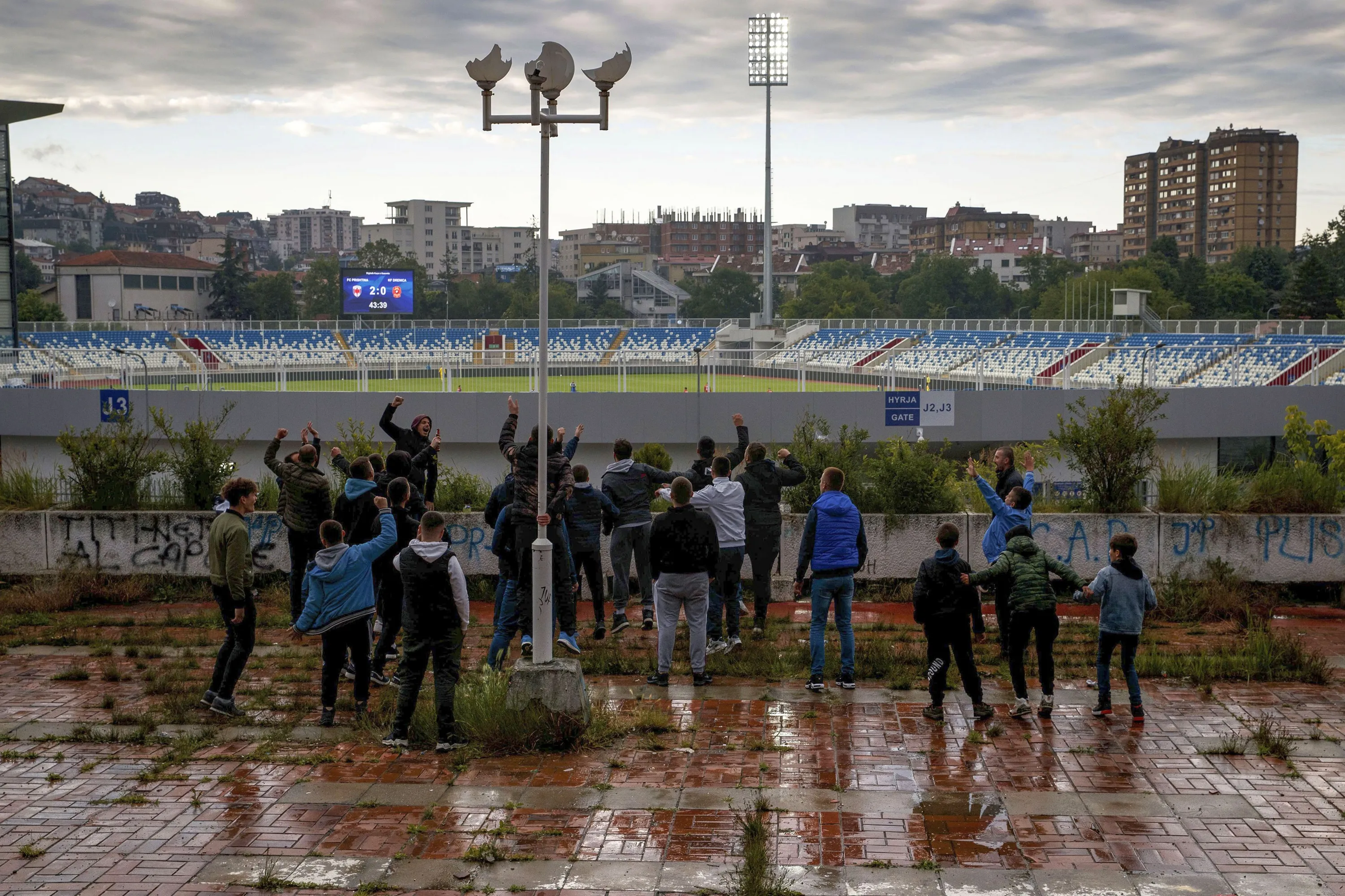 Fans of the soccer team Prishtina support their team outside the stadium during the Kosovo's Digitalb Cup soccer match between KF Prishtina and KF Drenica, in Pristina, Kosovo, 02 June 2020. The Kosovo's Digitalb Cup resumes without spectators after a suspension because of the coronavirus pandemic. (Photo by Valdrin Xhemaj/EPA/EFE/Rex Features/Shutterstock)