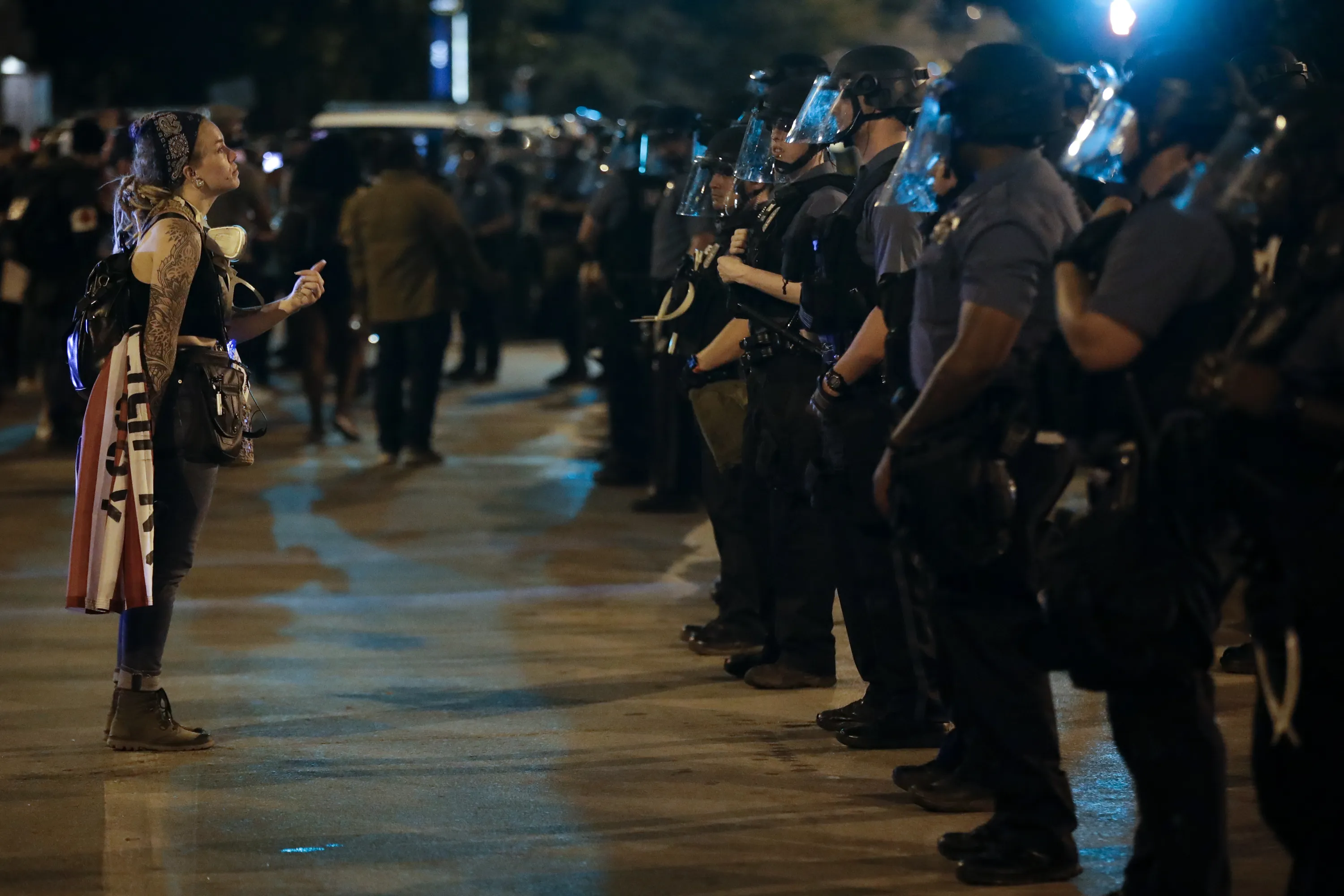 A protester confronts a line of police in riot gear near midnight Wednesday night, June 3, 2020, in Kansas City, Mo., after a unity march to protest against police brutality following the death of George Floyd, who died after being restrained by Minneapolis police officers on May 25. (Photo by Charlie Riedel/AP Photo)