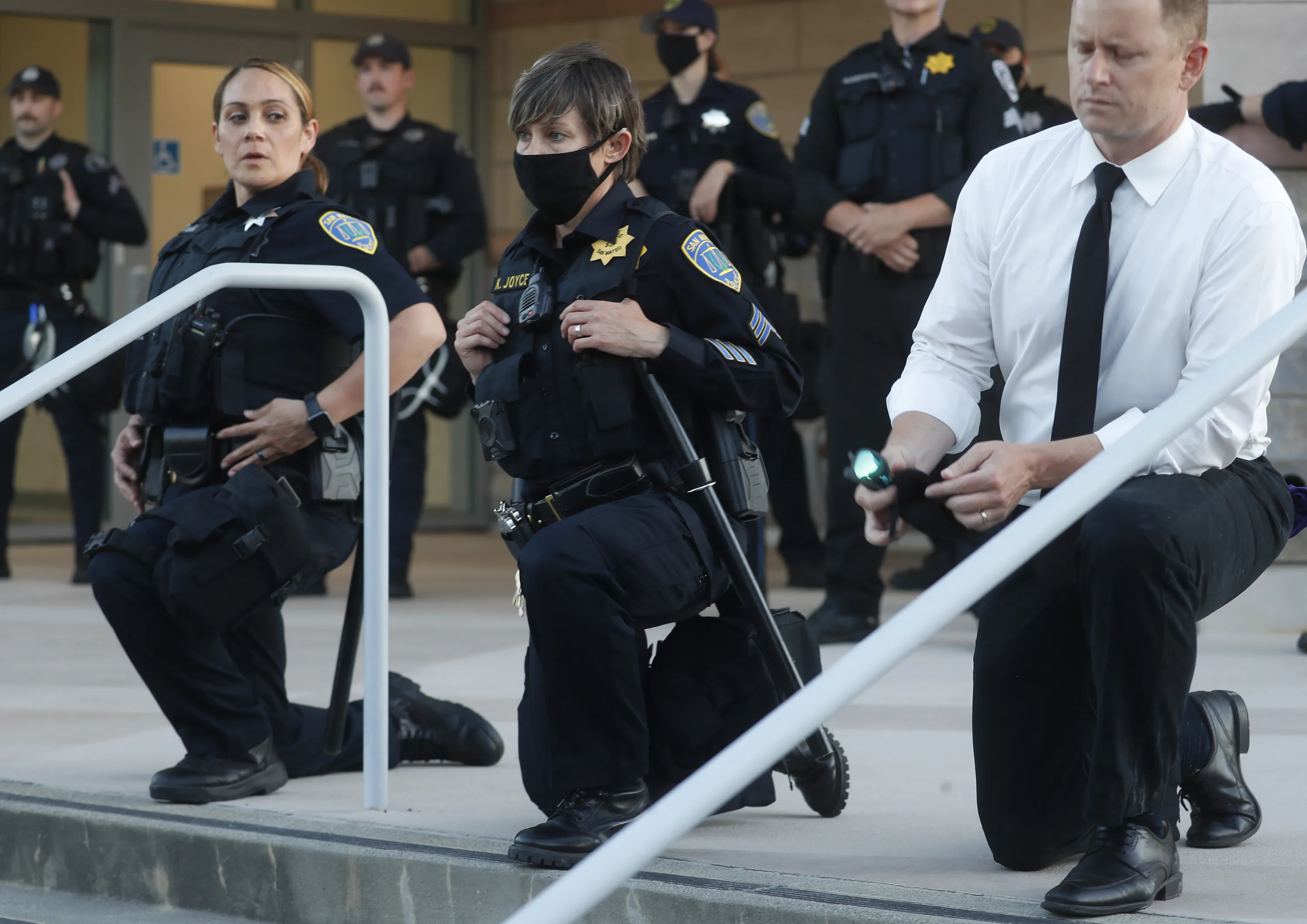 San Mateo Mayor Joe Goethals, right, kneels with two San Mateo Police officers during a protest of the killing of George Floyd in front of the San Mateo Police Department in San Mateo, Calif., on Wednesday, June 3, 2020. (Photo by Nhat V. Meyer/Bay Area News Group)