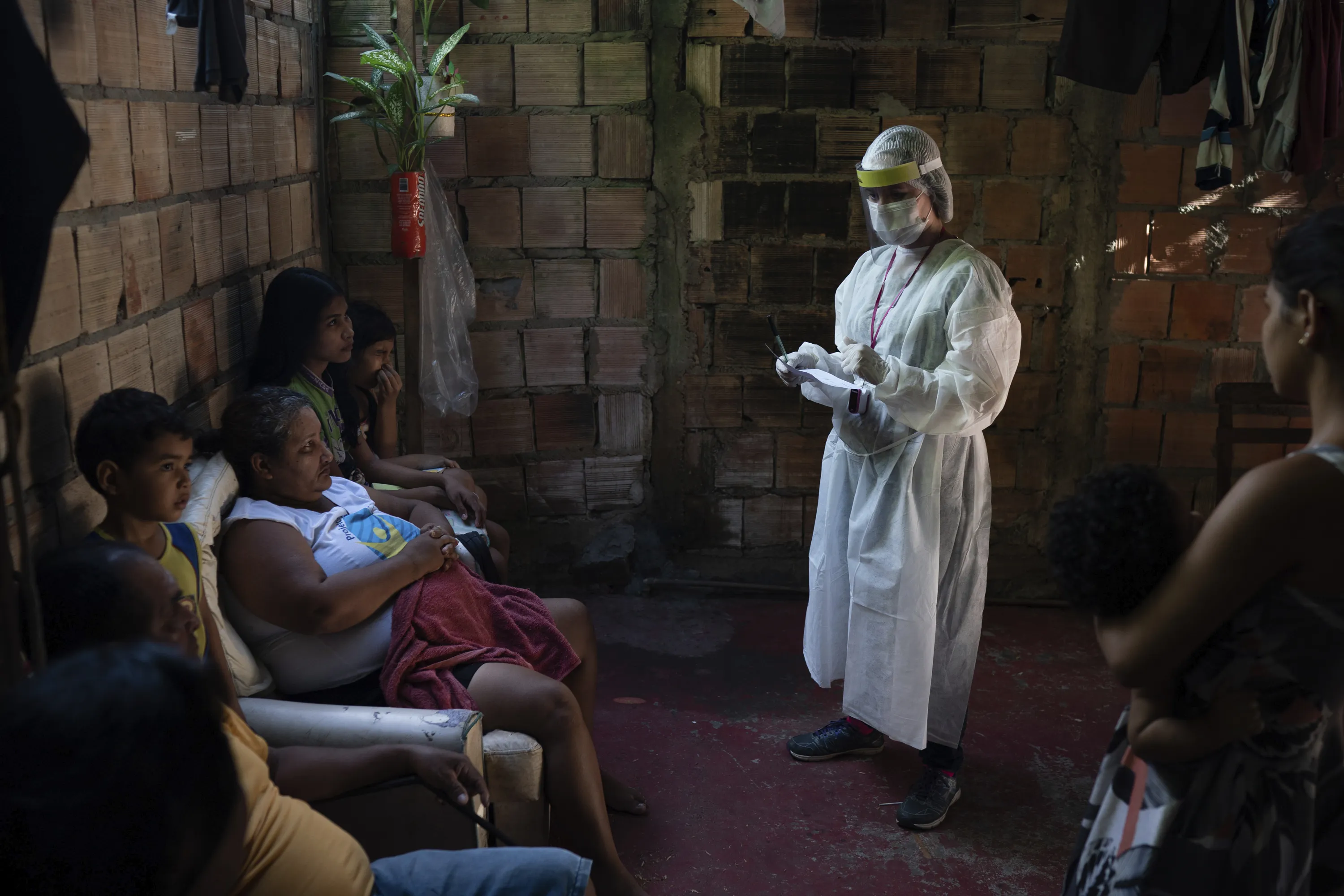 A health worker give instructions to members of Da Costa family after some of them tested positive for COVID-19 at their home in Manacapuru, Amazonas state, Brazil, Wednesday, June 3, 2020. (Photo by Felipe Dana/AP Photo)