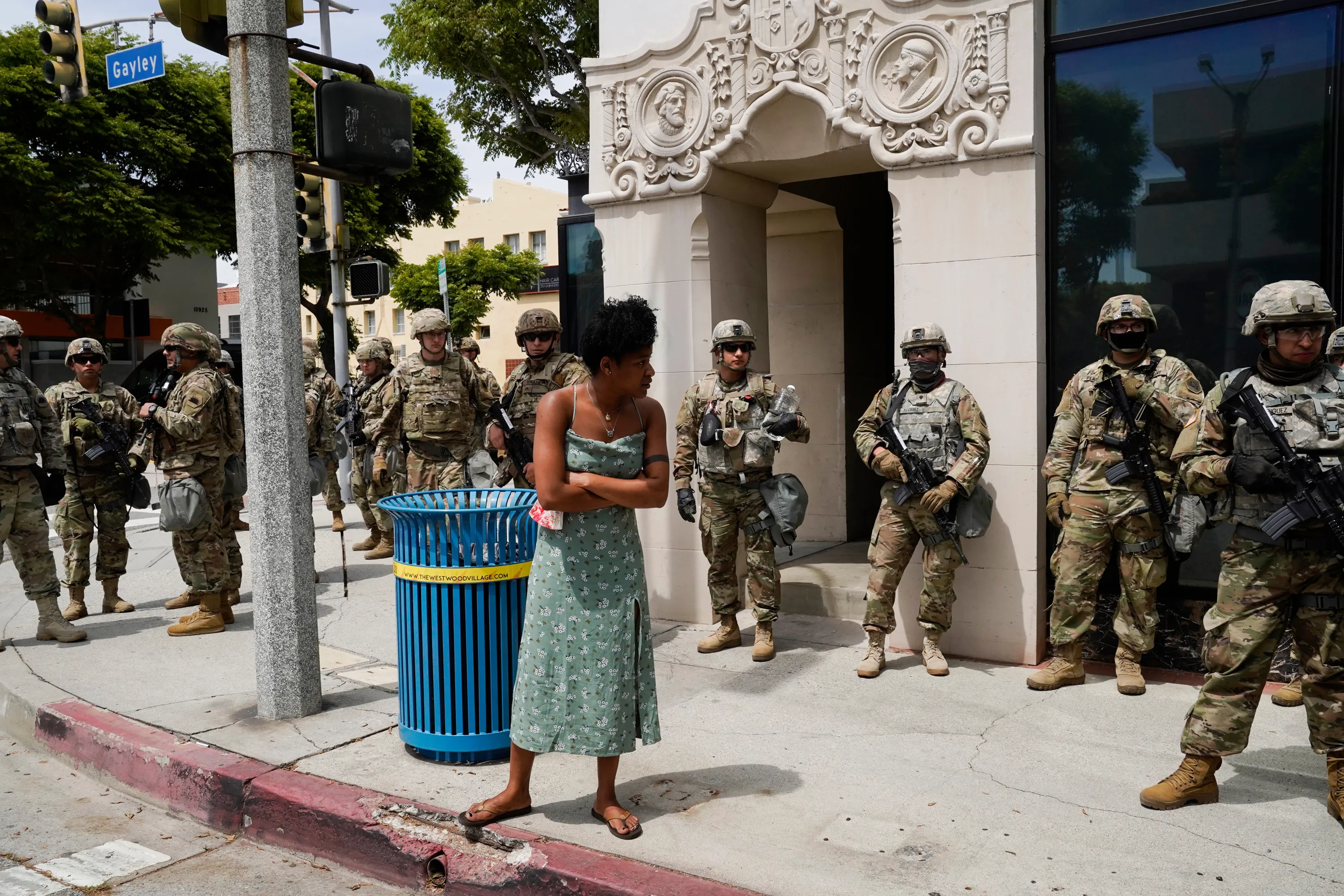 A woman talks to members of the National Guard as protests continue in the aftermath of George Floyd's death on June 1, 2020 in Los Angeles, California. Protests continue in cities throughout the country over the death of George Floyd, a black man who died in police custody in Minneapolis. The four officers involved have been fired and Derek Chauvin, the officer who pinned Floyd's neck to the ground, has been arrested and charged with 3rd degree murder. The National Guard has been deployed in Los Angeles and other major US cities to attempt to stem the tide of rising violence and unrest. California Governor Gavin Newsom has deployed National Guard troops to Los Angeles County to curb looting and destruction of property amid the protests. (Photo by Warrick Page/Getty Images)