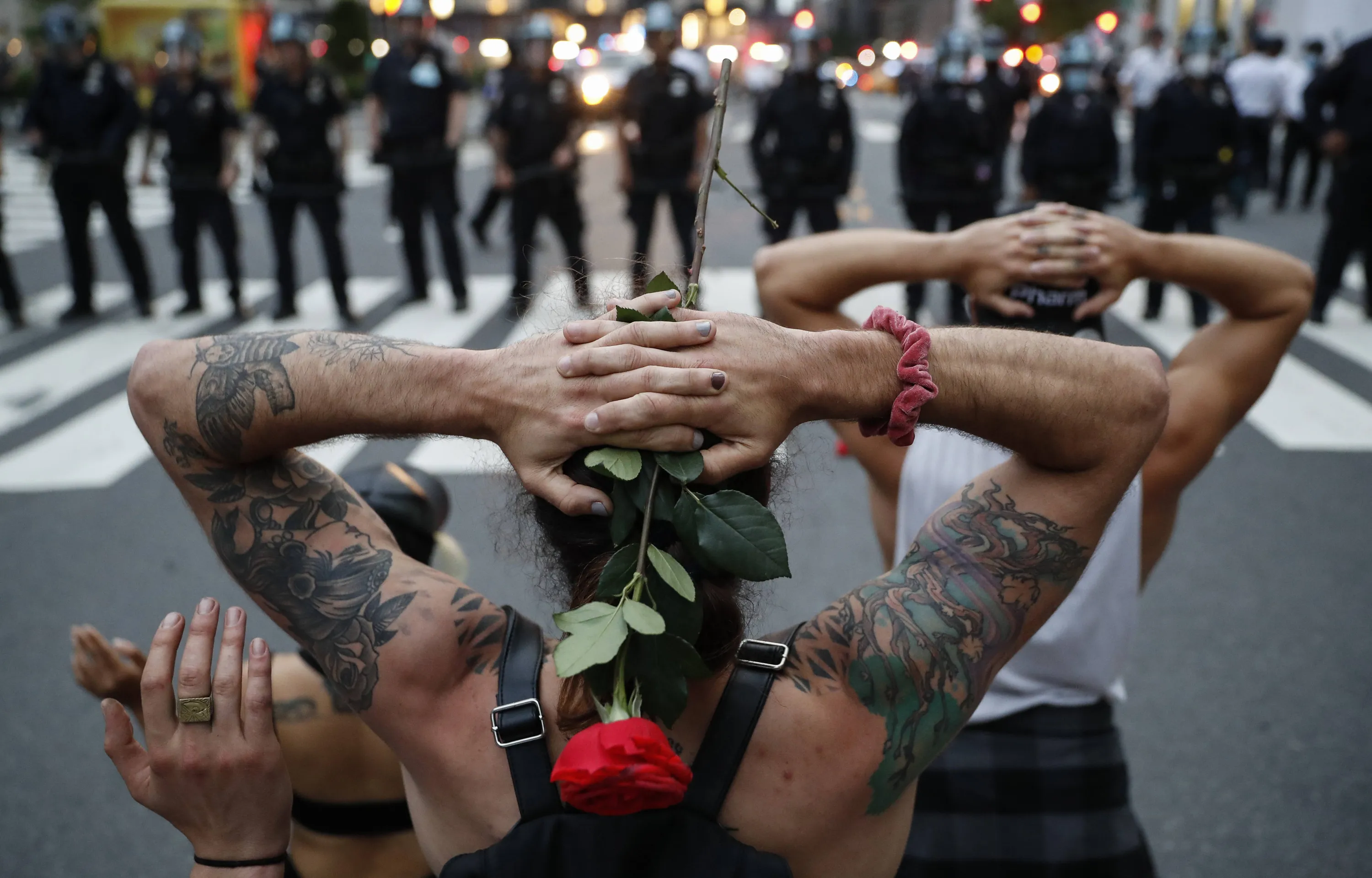 Protesters kneel in front of New York City Police Department officers before being arrested for violating curfew beside the iconic Plaza Hotel on 59th Street, Wednesday, June 3, 2020, in New York. Protests continued following the death of George Floyd, who died after being restrained by Minneapolis police officers on May 25. (Photo by John Minchillo/AP Photo)