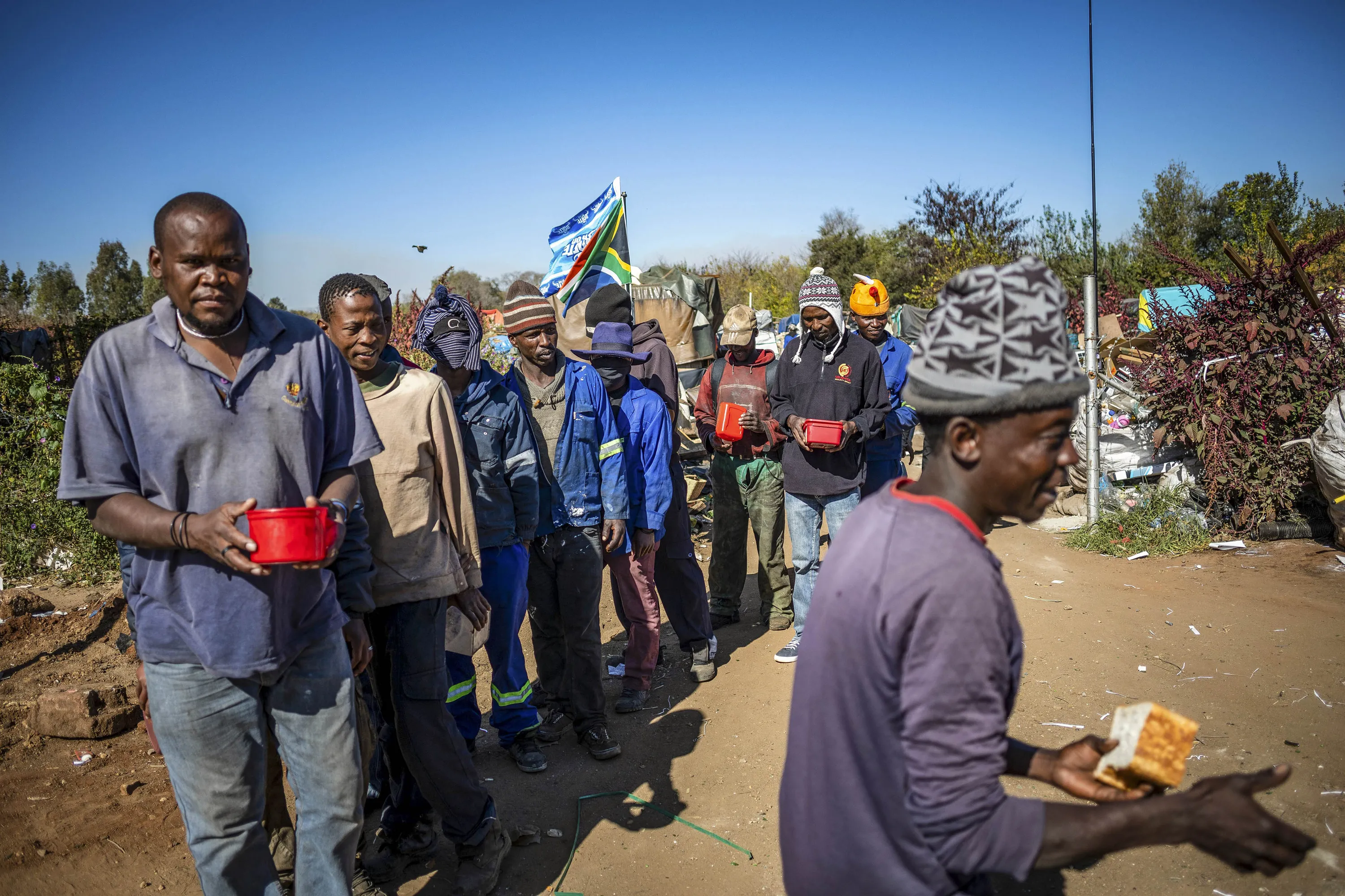 Local residents wait in a queue during a food handout by the Hennops River Revival NGO at a trash recycling area on day 61 of the national lockdown as a result of Covid-19 Coronavirus, Pretoria, South Africa, 27 May 2020. The recycling area is called 'Mushroom Farm' and is home to both South African and Besotho people who collect rash for recyling. Food insecurity is one of the main issues facing the country since the start of lockdown. The country is at level 4 of the national lockdown in its 61 day after it was implemented on 30 April 2020. (Photo by Kim Ludbrook/EPA/EFE/Rex Features/Shutterstock)