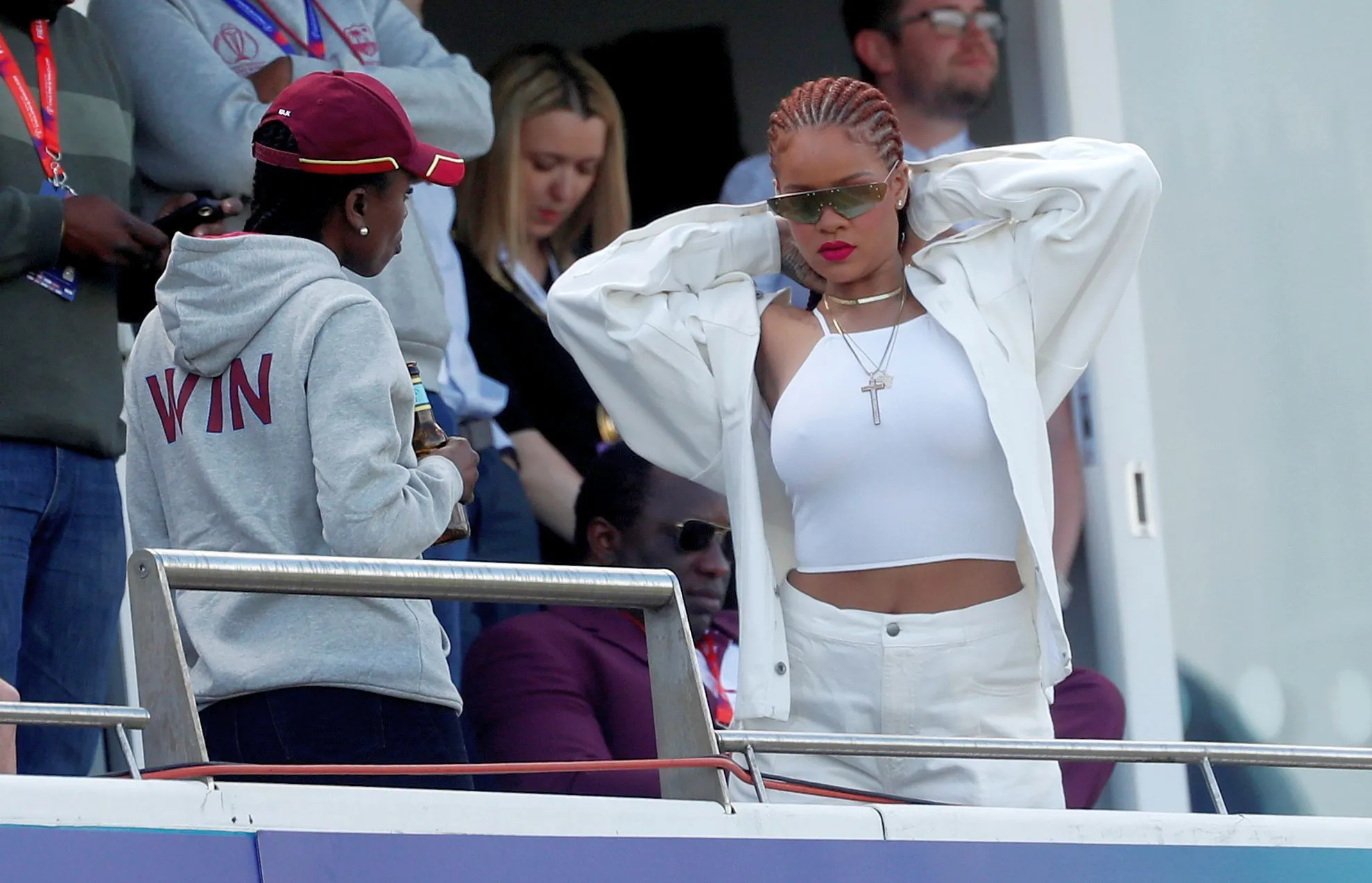 Singer Rihanna watches during the Group Stage match of the ICC Cricket World Cup 2019 between Sri Lanka and West Indies at Emirates Riverside on July 01, 2019 in Chester-le-Street, England. (Photo by Lee Smith/Action Images via Reuters)
