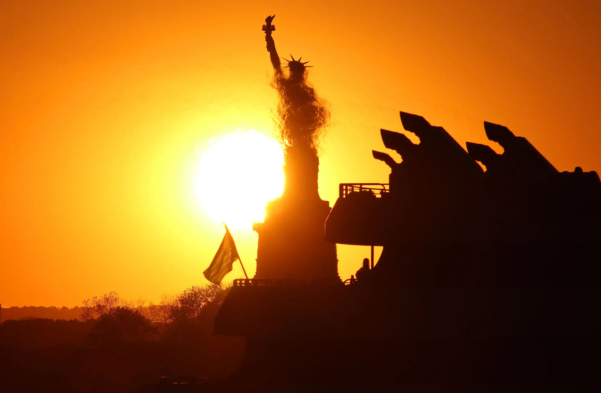 The sun sets behind the Statue of Liberty as it is partially obscurred by heat waves from the exhaust of a passing ferry on May 31, 2020 in New York City. (Photo by Gary Hershorn/Getty Images)
