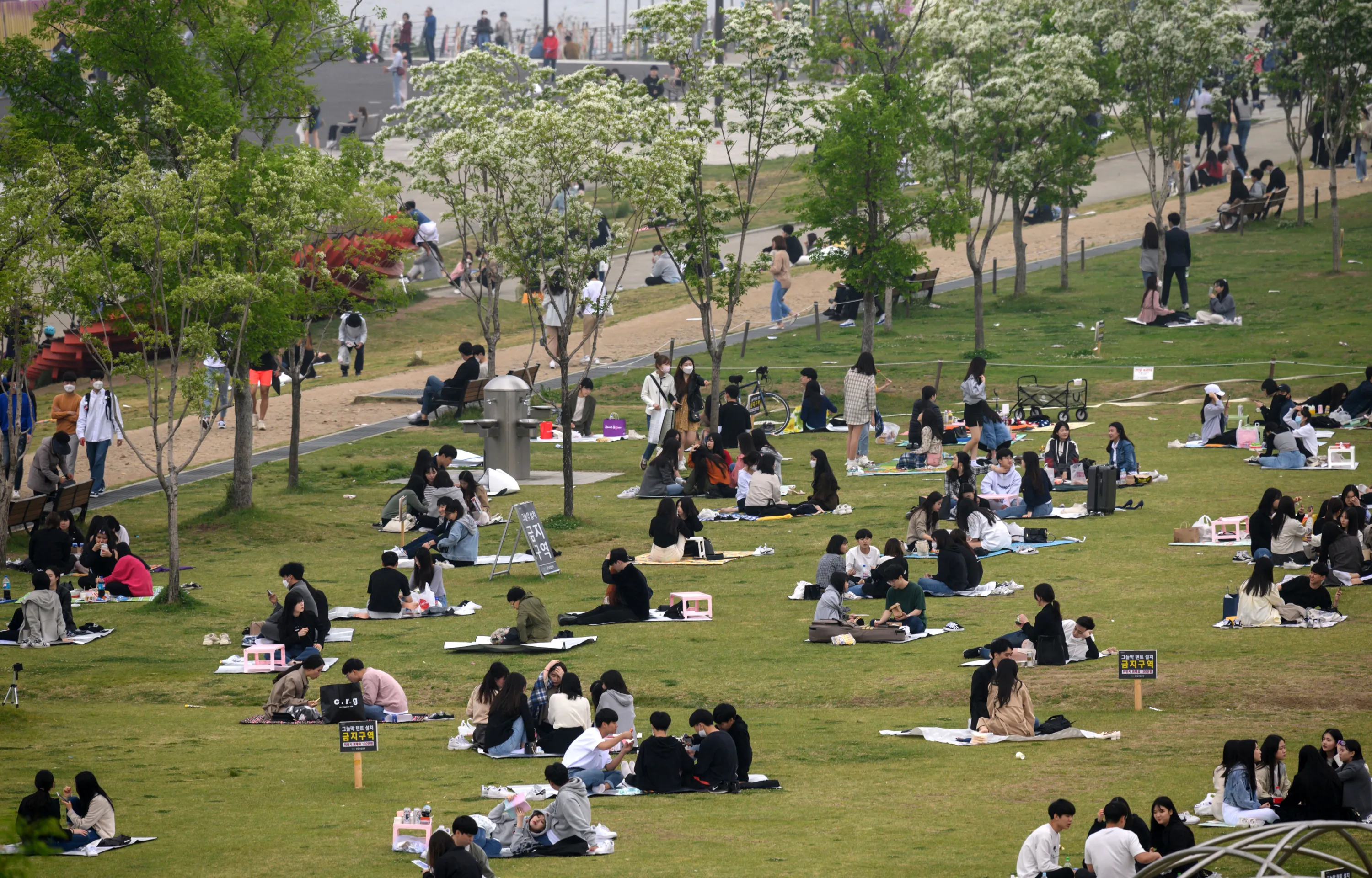 In a photo taken on May 10, 2020, people sit in a park in Seoul. South Korea announced its highest number of new coronavirus cases for more than a month on May 11, driven by an infection cluster in a Seoul nightlife district just as the country loosens restrictions. (Photo by Ed Jones/AFP Photo)
