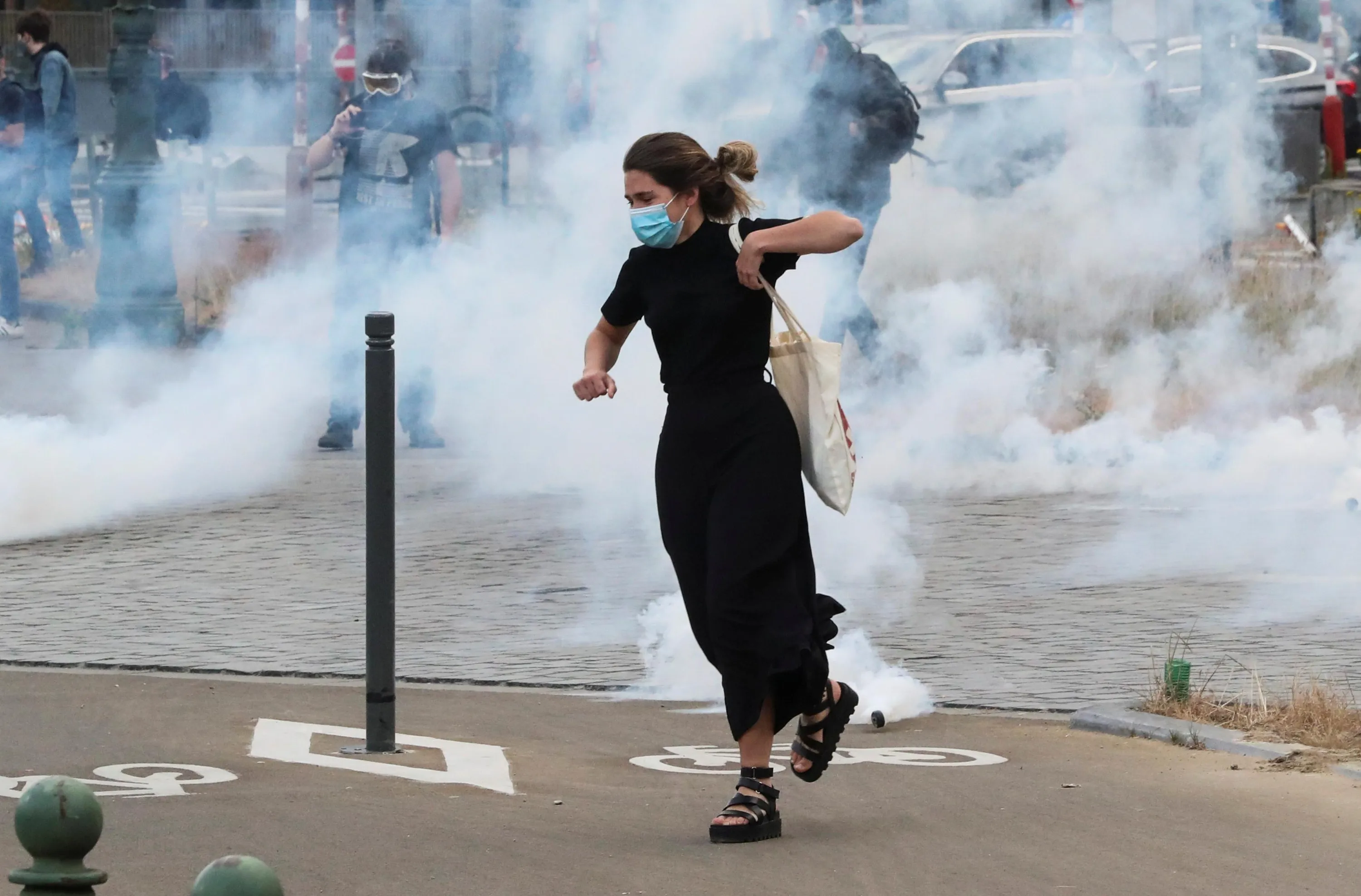 A demonstrator flees from tear gas during a protest, organised by Black Lives Matter Belgium, against racial inequality in the aftermath of the death in Minneapolis police custody of George Floyd, in central Brussels, Belgium on June 7, 2020. (Photo by Yves Herman/Reuters)