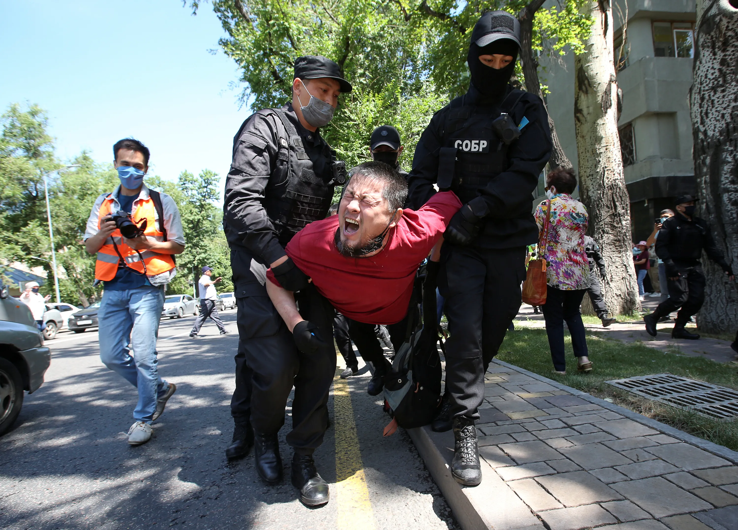 Kazakh law enforcement officers wearing protective face masks, which are used as a preventive measure against the coronavirus disease (COVID-19), detain a man during an unsanctioned rally held by opposition supporters in Almaty, Kazakhstan on June 6, 2020. (Photo by Pavel Mikheyev/Reuters)