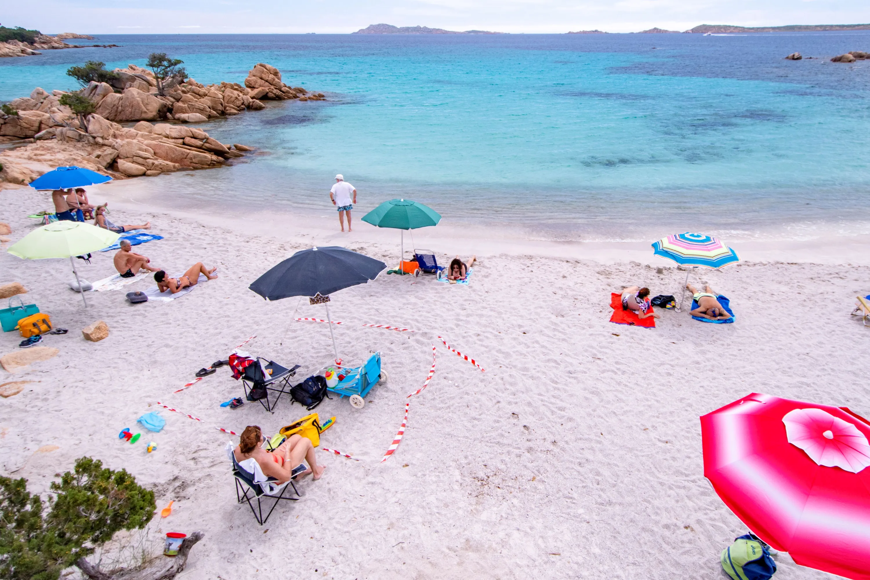 Some tourists on a beach in Sardinia try to respect the rules of social distancing by using a white and red ribbon to mark their space on the beach on the first weekend of phase 3 after the lockdown due to Covid-19 on June 07, 2020 in Porto Cervo, Sardegna, Italy. Many Italian businesses have been allowed to reopen, after more than two months of a nationwide lockdown meant to curb the spread of Covid-19. (Photo by Emanuele Perrone/Getty Images)
