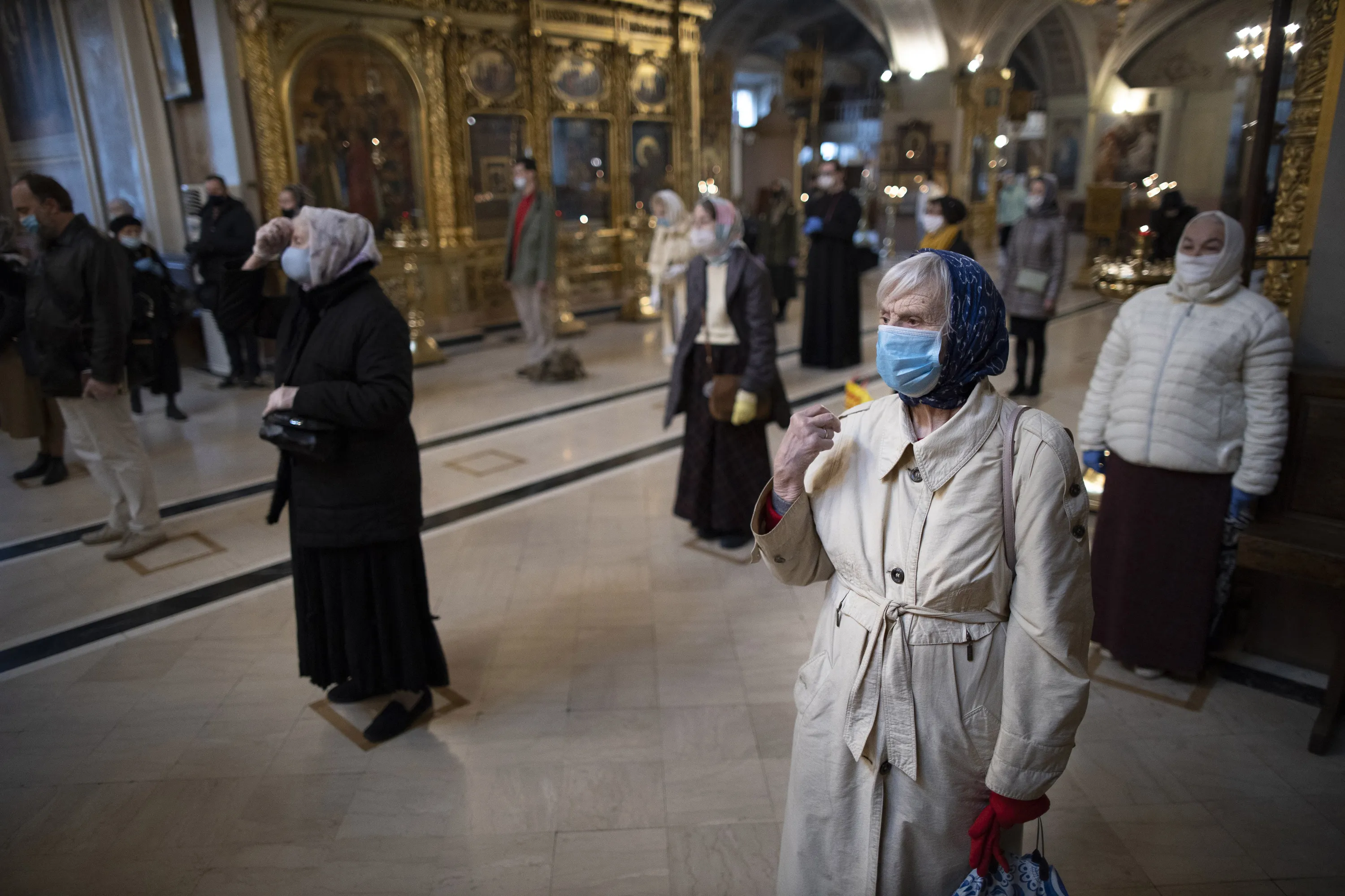 Parishioners wearing face masks to protect against coronavirus, observe social distancing guidelines cross themselves as they attend service at the Epiphany Cathedral in Moscow, Russia, Tuesday, June 2, 2020. Churches in Moscow reopen to believers after a two-month lockdown imposed to control the spread of the coronavirus. (Photo by Alexander Zemlianichenko/AP Photo)