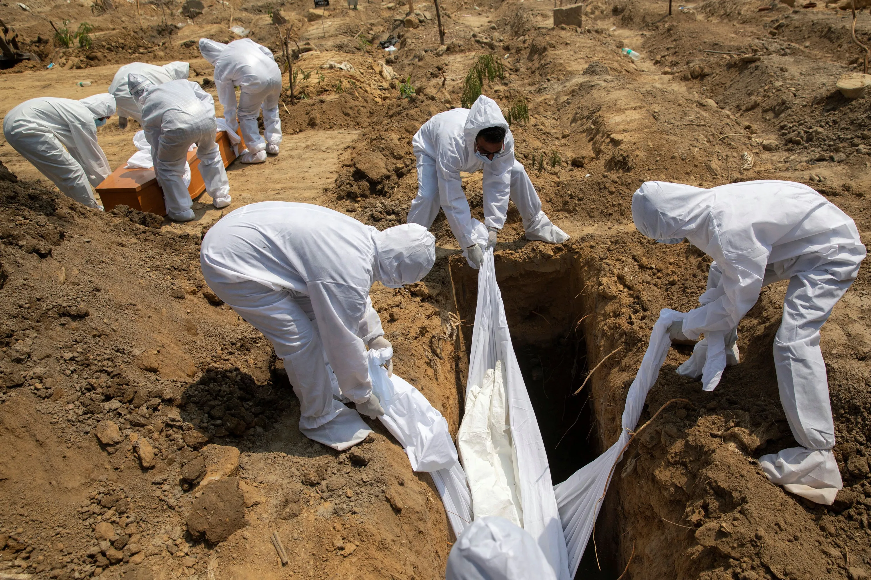 Relatives lower the body of a man who died from the coronavirus disease (COVID-19), as others prepare another victim for burial at a graveyard in New Delhi, India, June 8, 2020. (Photo by Danish Siddiqui/Reuters)