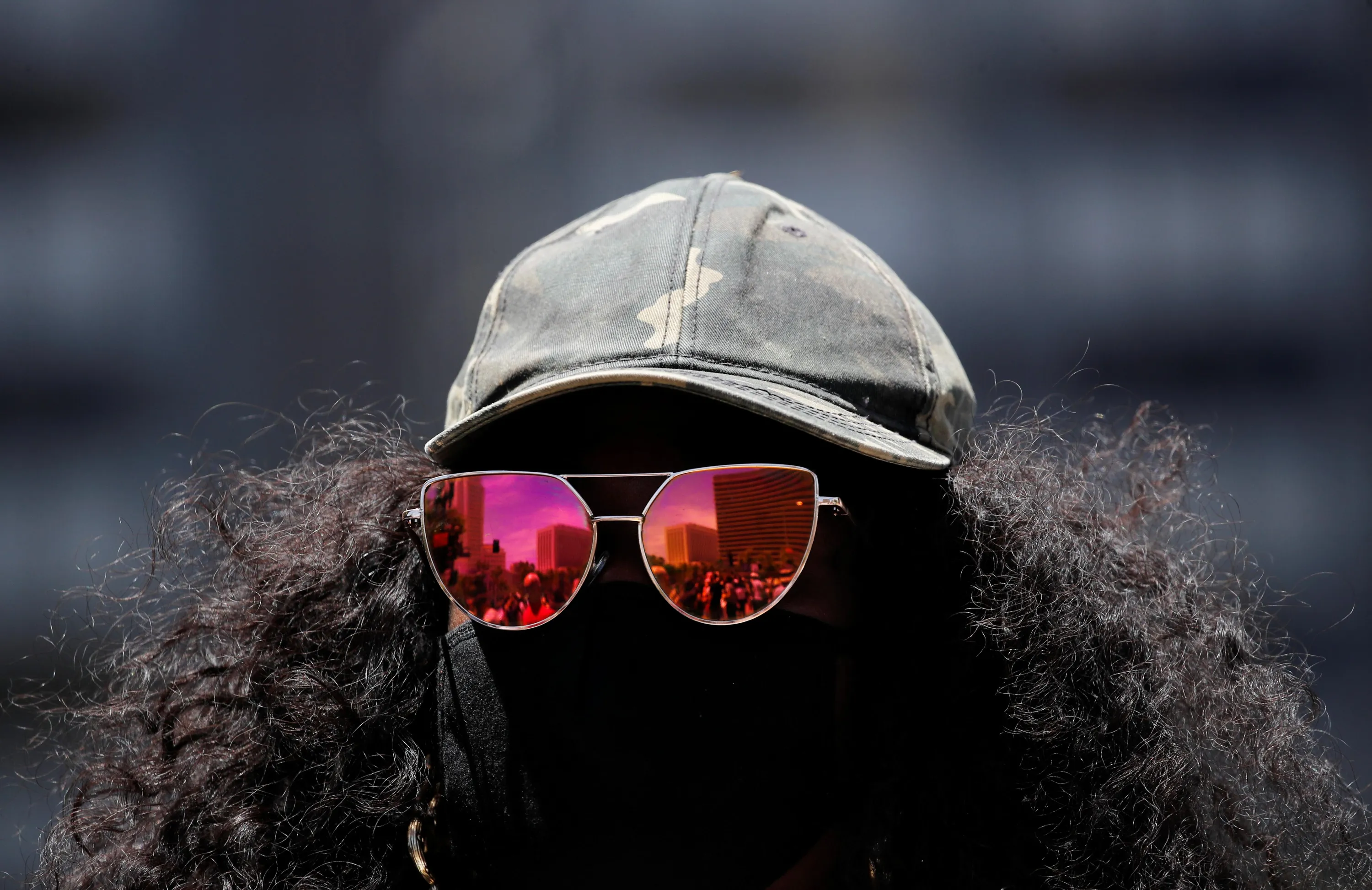 Tiffany Simms wears a protective mask and sunglasses as she attends a protest against racial inequality in the aftermath of the death in Minneapolis police custody of George Floyd in Los Angeles, California, U.S. June 8, 2020. (Photo by Mike Blake/Reuters)