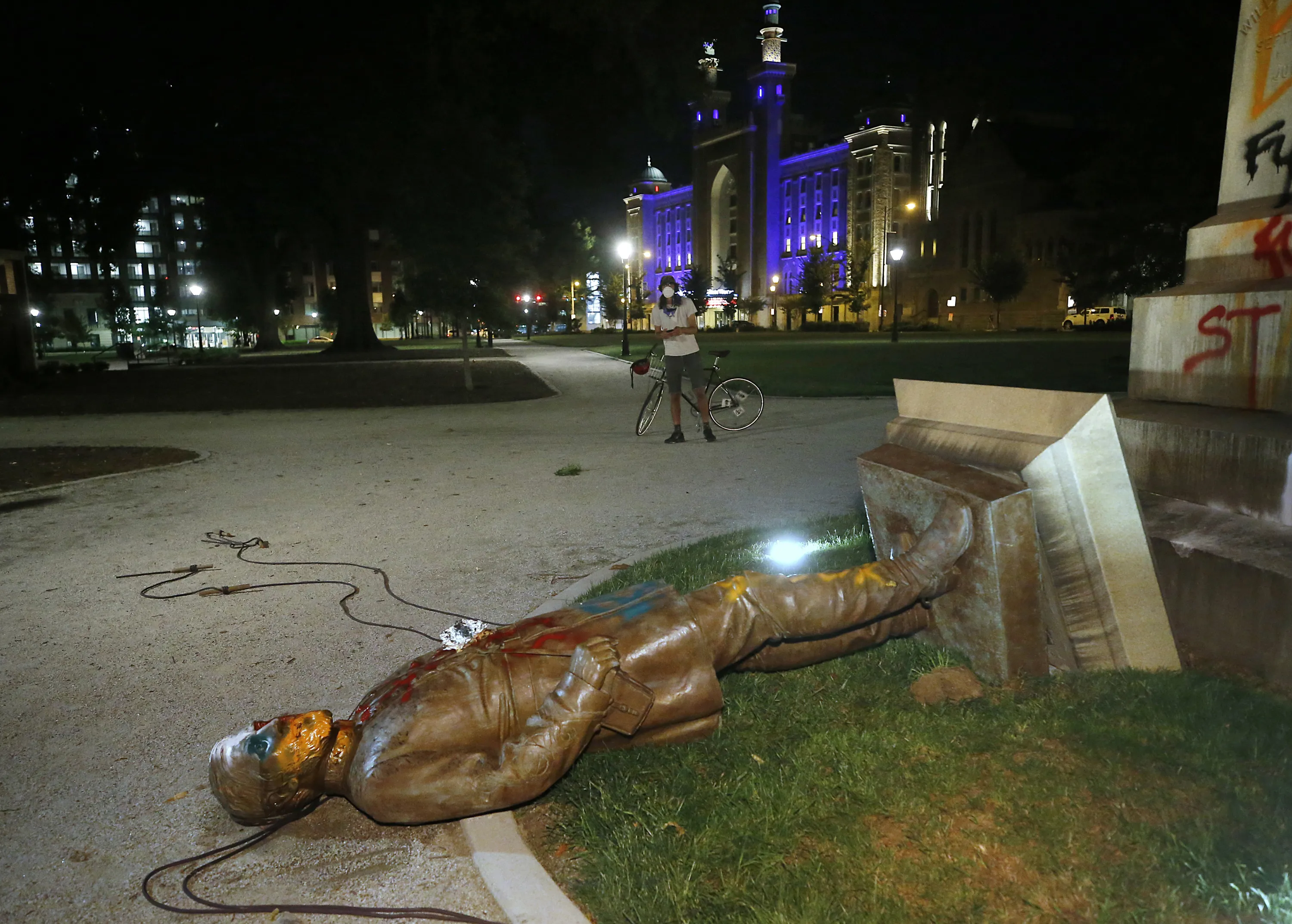 The statue of Confederate Gen. Williams Carter Wickham lies on the ground after protesters pulled it down Saturday, June 6, 2020, in Monroe Park in Richmond, Va. The statue had stood in the park since 1891. (Photo by Alexa Welch Edlund/Richmond Times-Dispatch via AP Photo)