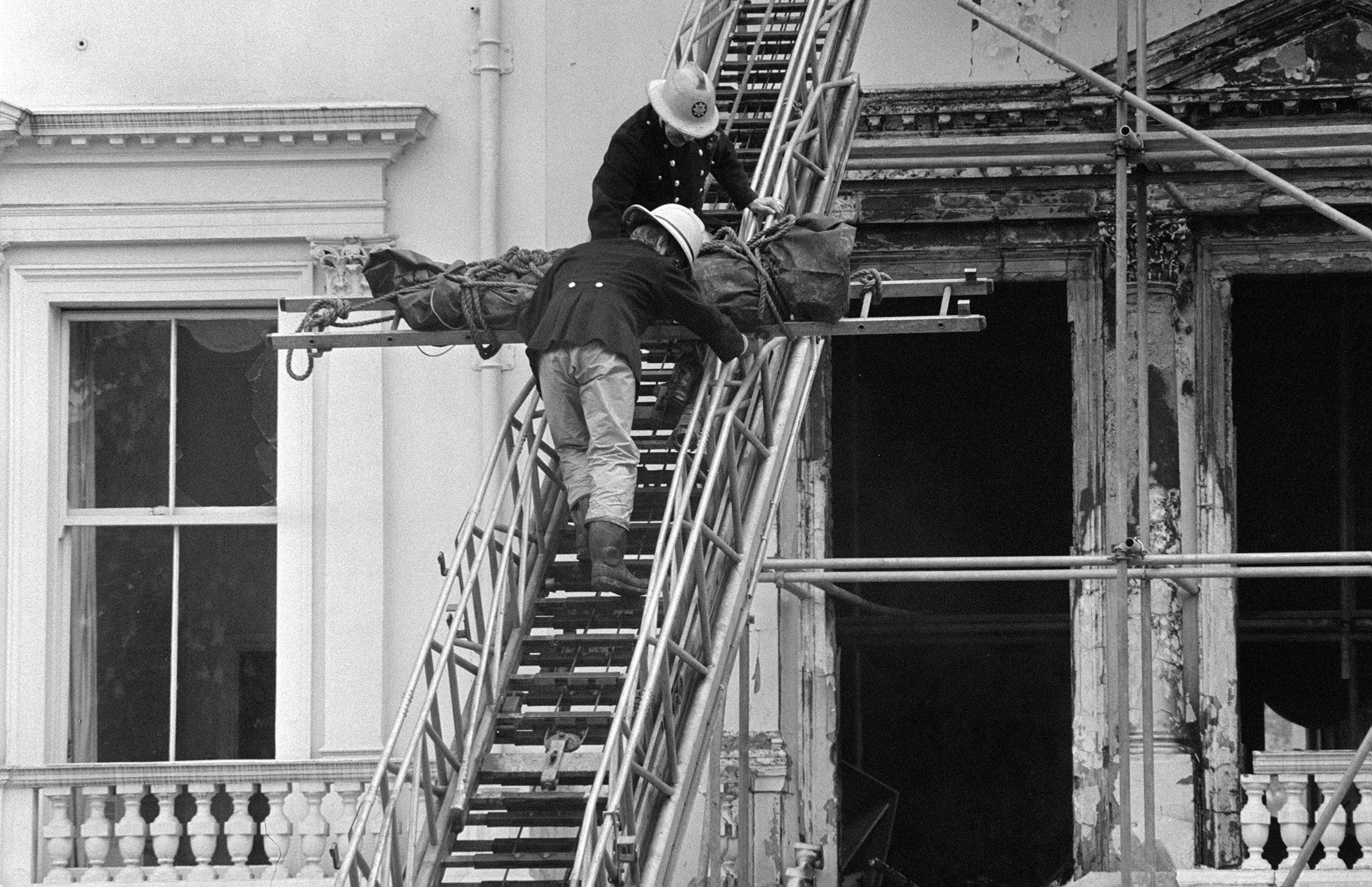 Firemen removing one of two bodies so far found in the burnt-out remains of the Iranian Embassy in London on May 7, 1980. The corpse, wrapped in a dark green body bag, was lowered from a second floor front window of the building in Princes gate, Kensington, and taken away by a hearse. (Photo by PA Images via Getty Images)
