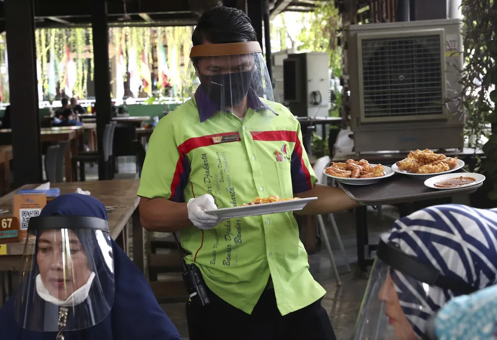 A waiter wearing protective face shield to help curb the spread of the new coronavirus delivers dishes to customers at a seafood restaurant on the outskirts of Jakarta, Indonesia, Wednesday, June 10, 2020. As Indonesia's overall virus caseload continues to rise, Jakarta has moved to restore normalcy by lifting some restrictions this week, saying that the spread of the virus in the city of 11 million has slowed after peaking in mid-April. (Photo by Tatan Syuflana/AP Photo)