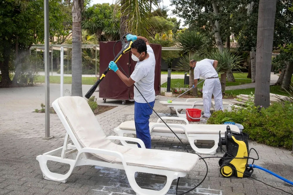 Employees disinfect the loungers at swimming pool area of the RIU Bravo Hotel in Palma de Mallorca on June 10, 2020 as the Balearic Islands prepare to welcome German tourists from June 15 as a test before Madrid reopens international borders on July 1 (Photo by Jaime Reina/AFP Photo)