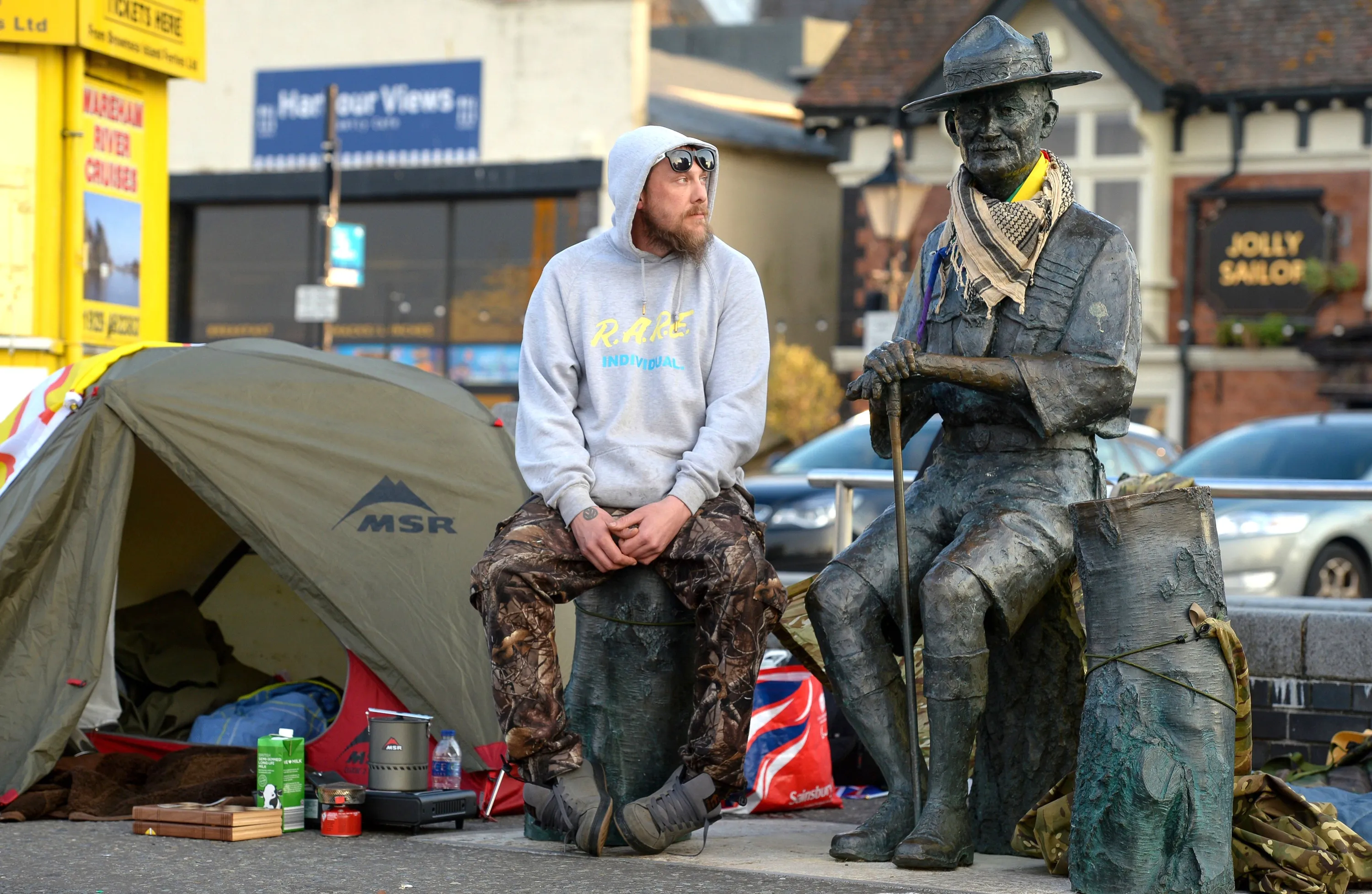 Former Scout Dan Davies at his tent, set up to protect the Lord Baden-Powell statue on June 12, 2020 in Poole, United Kingdom. The statue of Robert Baden-Powell on Poole Quay is to be placed into safe storage after campaigners have accused him of racism, homophobia and support for Adolf Hitler. (Photo by Finnbarr Webster/Getty Images)
