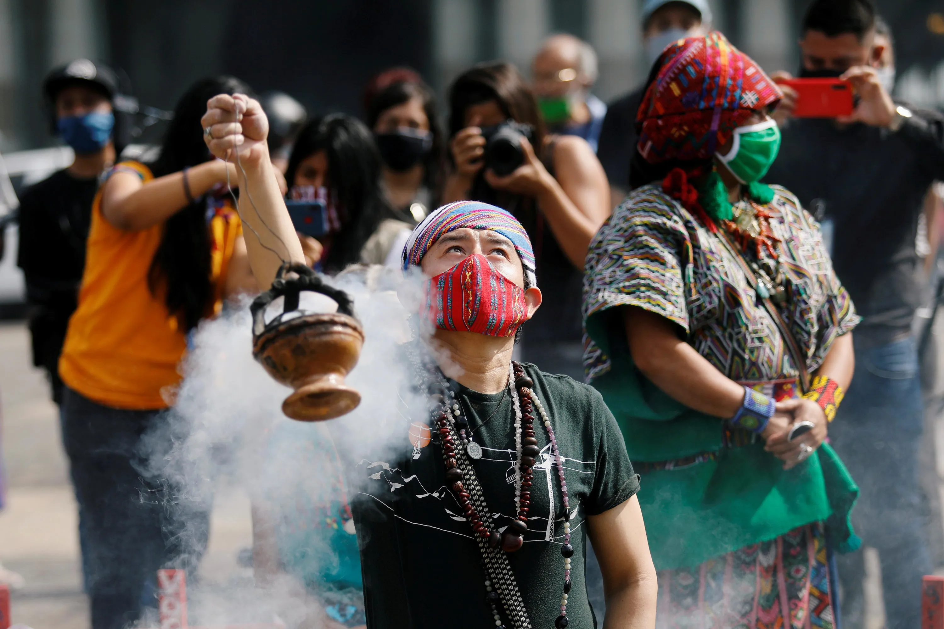 Mayan indigenous people take part in a ceremony in memory of Domingo Choc, a 56-year-old practitioner of traditional Maya medicine who was set ablaze by a mob accusing him of witchcraft, at the Parque Central in Guatemala City, Guatemala on June 10, 2020. (Photo by Luis Echeverria/Reuters)
