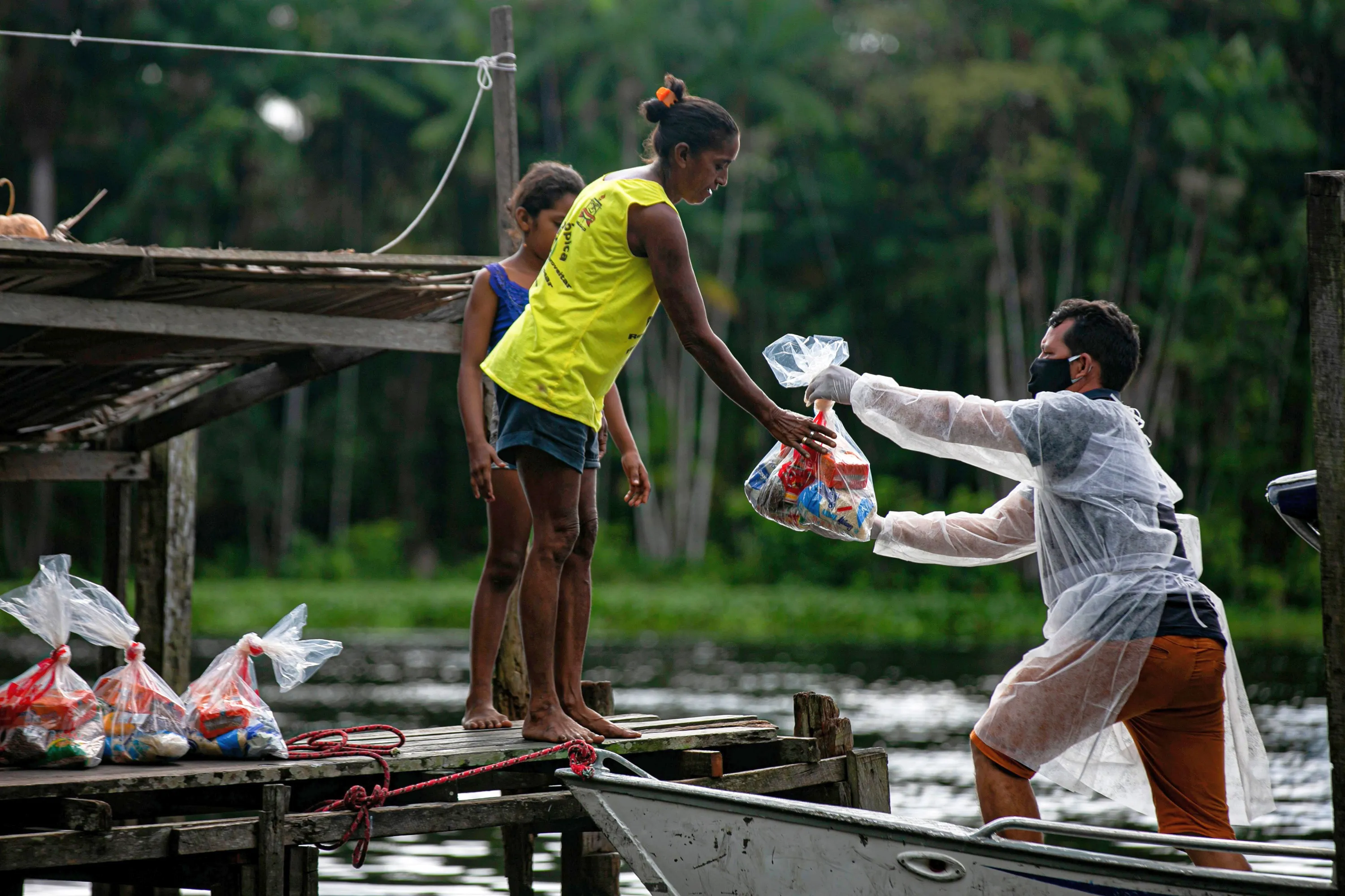 An Education Ministry staffer wears a protective suit while delivering free school lunch kits for locals in need in Megalco, state of Para, Brazil on June 11, 2020, amid the COVID-19 coronavirus pandemic. Megalco has more than 10,000 school students and classes will not resume for at least another three months due to the pandemic. (Photo by Tarso Sarraf/AFP Photo)