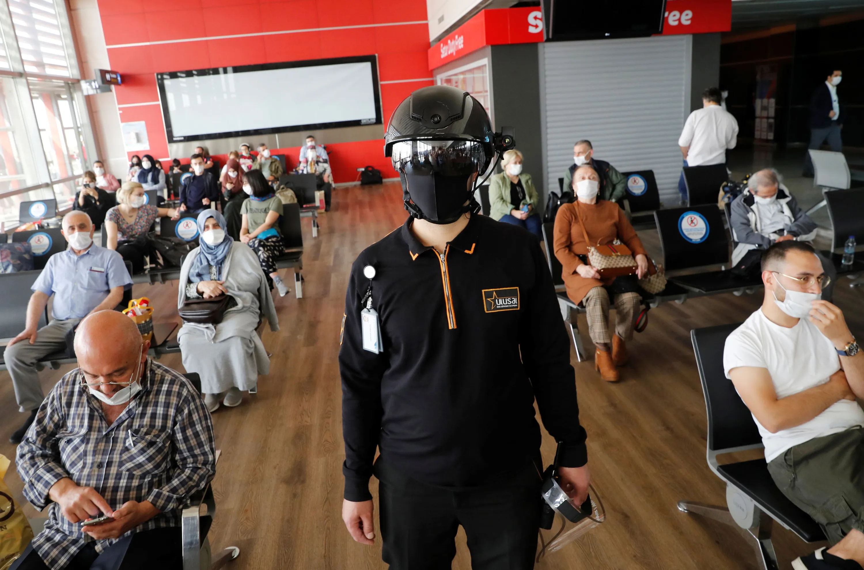 A security employee wearing a thermal imaging VF helmet monitors passengers as they wait for to board an Anadolujet flight to Stuttgart, Germany at Sabiha Gokcen Airport during the first day of resumed international flights that were halted amid the spread of the coronavirus disease (COVID-19), in Istanbul, Turkey on June 11, 2020. (Photo by Murad Sezer/Reuters)