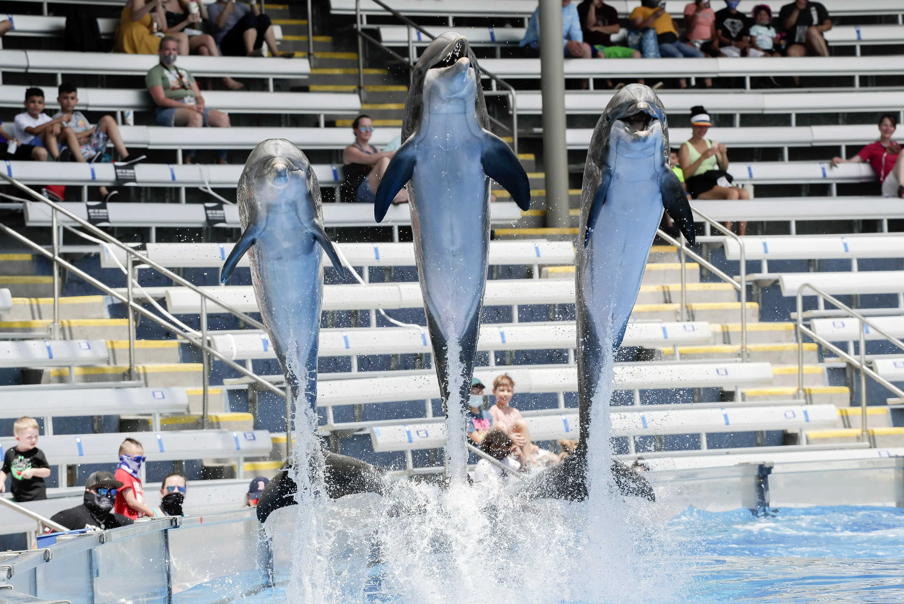 Guests watch as dolphins leap from the water during a show at SeaWorld as it reopened with new safety measures in place=, Thursday, June 11, 2020, in Orlando, Fla. The park had been closed since mid-March to stop the spread of the coronavirus. (Photo by John Raoux/AP Photo)