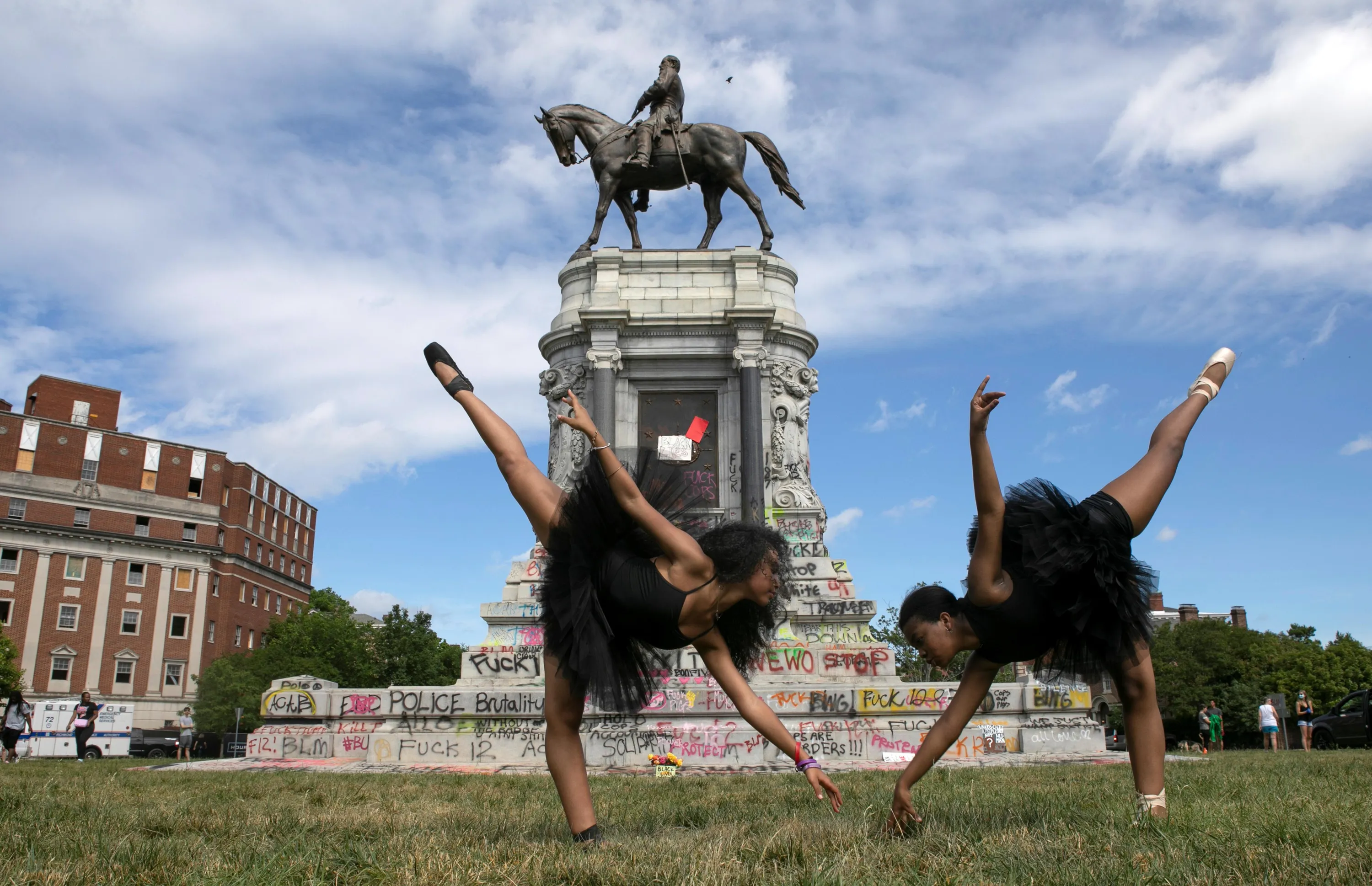 Ballerinas Kennedy George, 14, and Ava Holloway, 14, pose in front of a monument of Confederate general Robert E. Lee after Virginia Governor Ralph Northam ordered its removal after widespread civil unrest following the death in Minneapolis police custody of George Floyd, in Richmond, Virginia, U.S. June 5, 2020. (Photo by Julia Rendleman/Reuters)