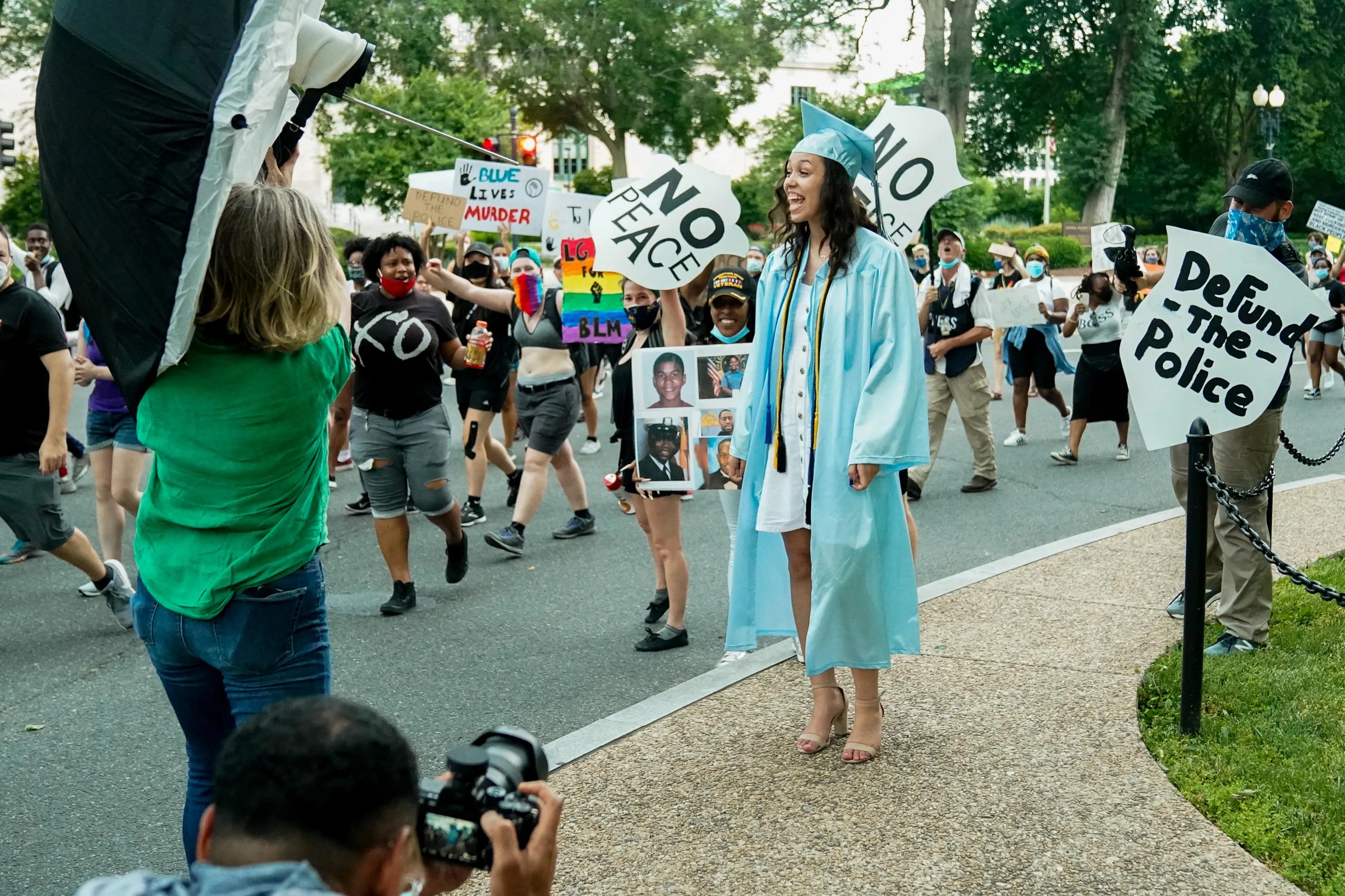 Protesters cheer for high school graduate Leah Powell during a march against racial inequality in the aftermath of the death in Minneapolis police custody of George Floyd, at the Lincoln Memorial in Washington, U.S., June 10, 2020. (Photo by Erin Scott/Reuters)
