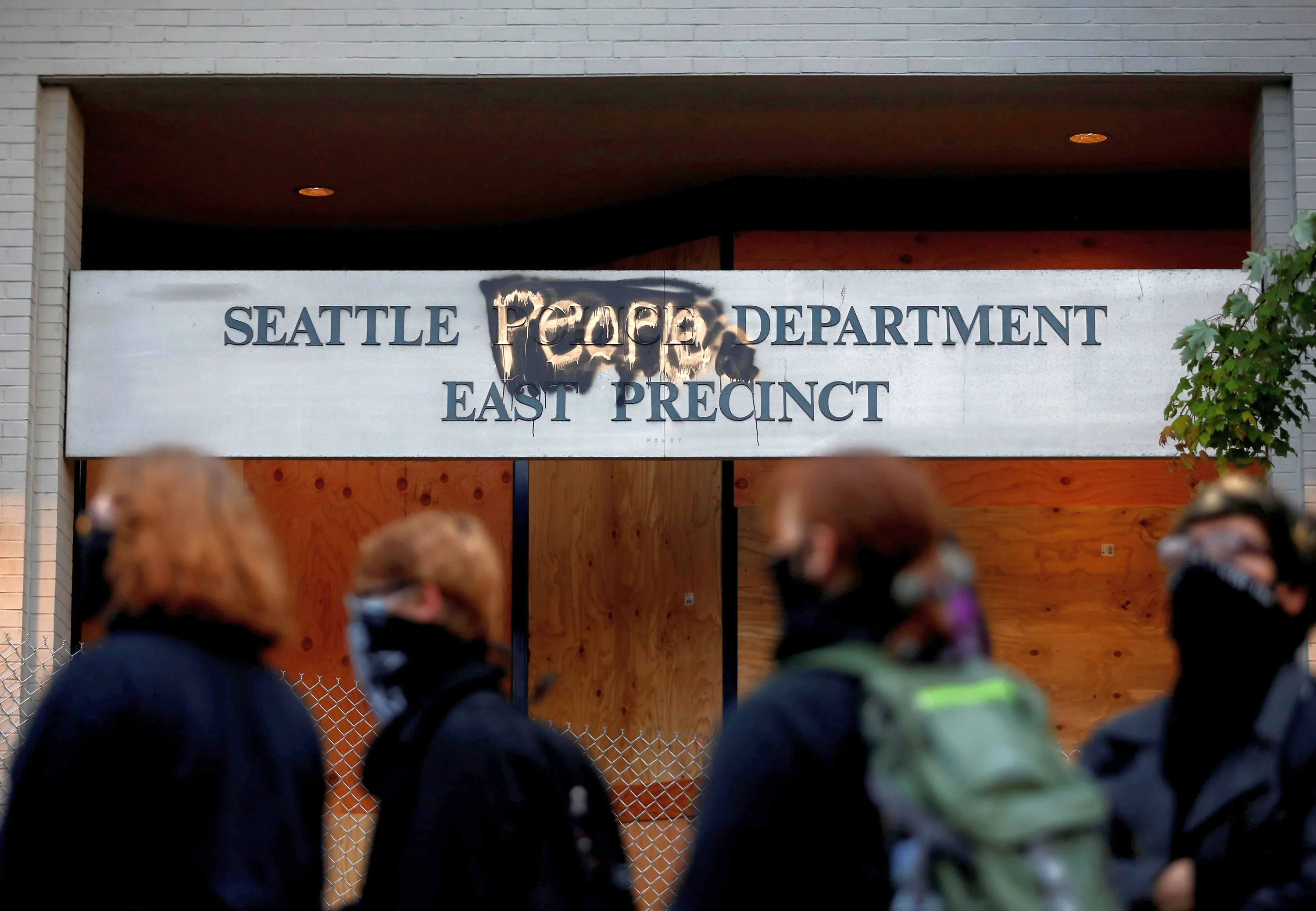 People stand in front of the Seattle Police Department's East Precinct sign, spray painted to replace “police” with “people” as the protesters established what they call an autonomous zone while continuing to demonstrate against racial inequality and call for defunding of Seattle police, in Seattle, Washington, U.S. June 9, 2020. (Photo by Lindsey Wasson/Reuters)