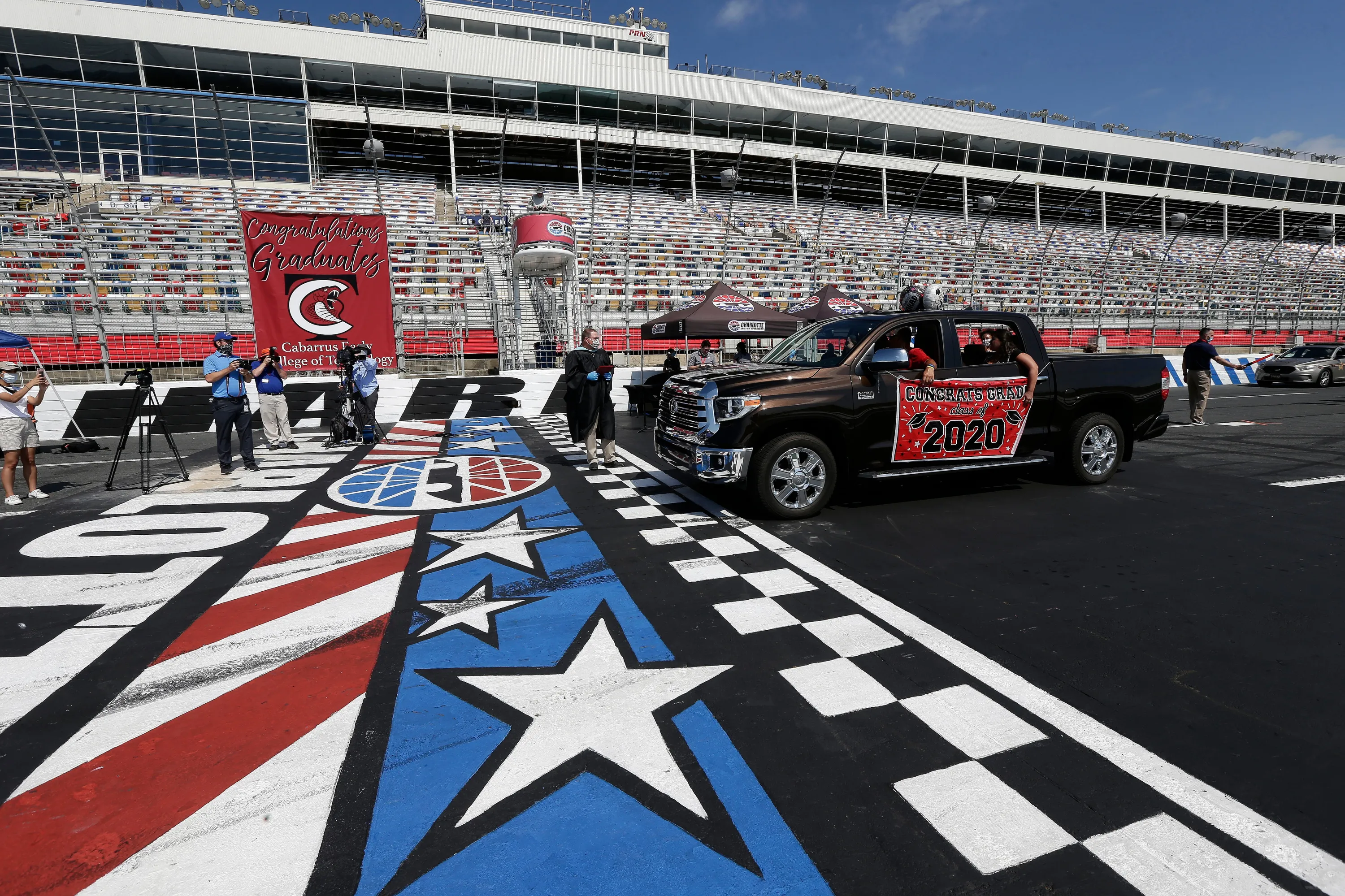 Class of 2020 graduating seniors from Cabarrus Early College of Technology drive across the start-finish line at the Charlotte Motor Speedway to receive their diplomas during a graduation event in Concord, N.C., Friday, June 12, 2020. Due to the coronavirus pandemic Cabarrus County schools participated in a first-of-its-kind commencement ceremony for it's students and family. (Photo by Gerry Broome/AP Photo)