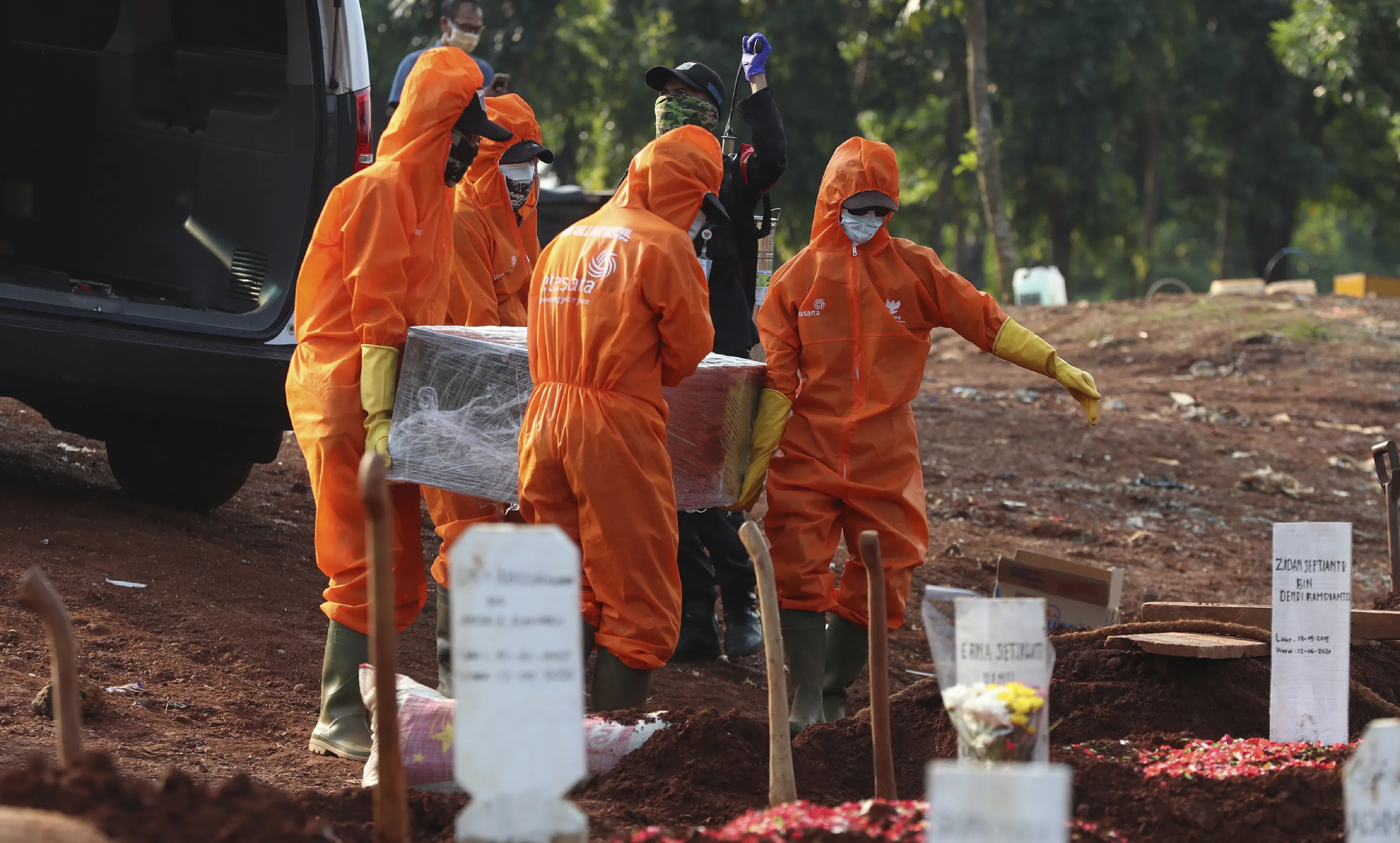 Workers in protective suits carry the coffin of a suspected victim of COVID-19 during a burial at Pondok Ranggon cemetery in Jakarta, Indonesia, Friday, June 12, 2020. (Photo by Achmad Ibrahim/AP Photo)