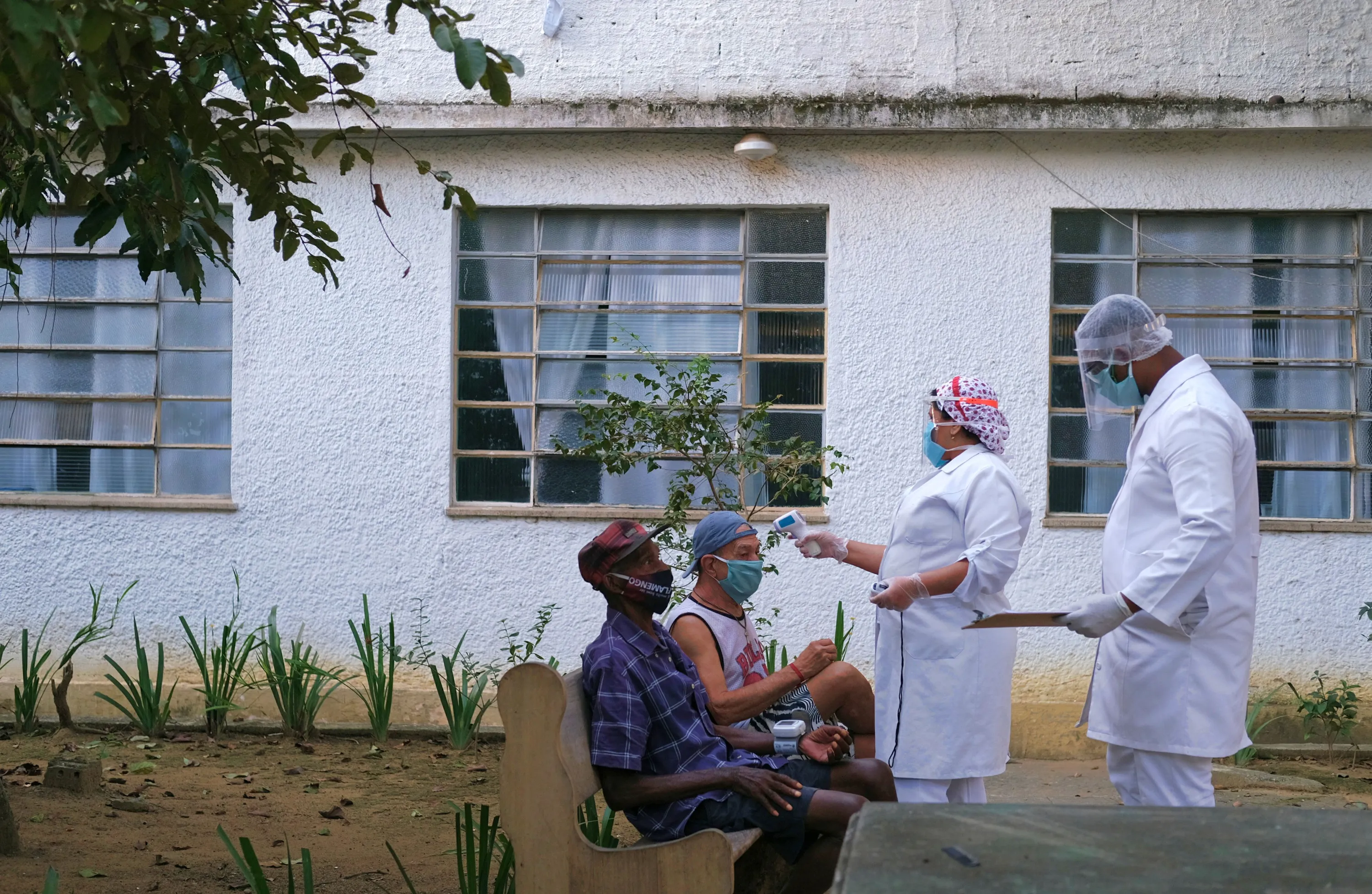 Caregivers check elderly men at the Sao Francisco de Assis shelter for the elderly, where nine residents with symptoms of the coronavirus disease (COVID-19) have been placed in isolation, according to the shelter, in Sao Joao do Meriti, near Rio de Janeiro, Brazil, June 12, 2020. (Photo by Ricardo Moraes/Reuters)