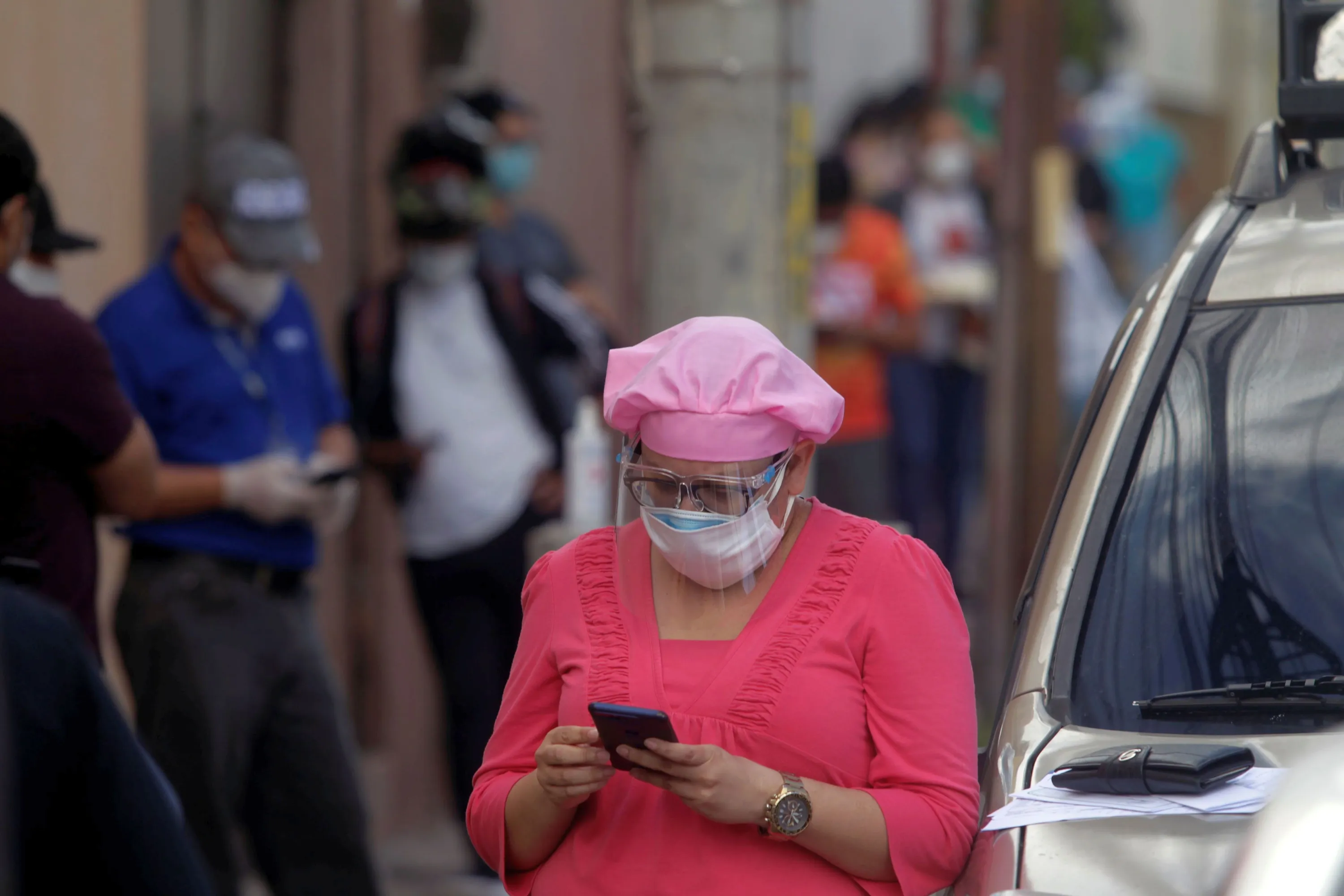 A woman checks her phone while waiting in line to be tested for the coronavirus disease (COVID-19), outside a private lab in Tegucigalpa, Honduras on June 12, 2020. (Photo by Jorge Cabrera/Reuters)
