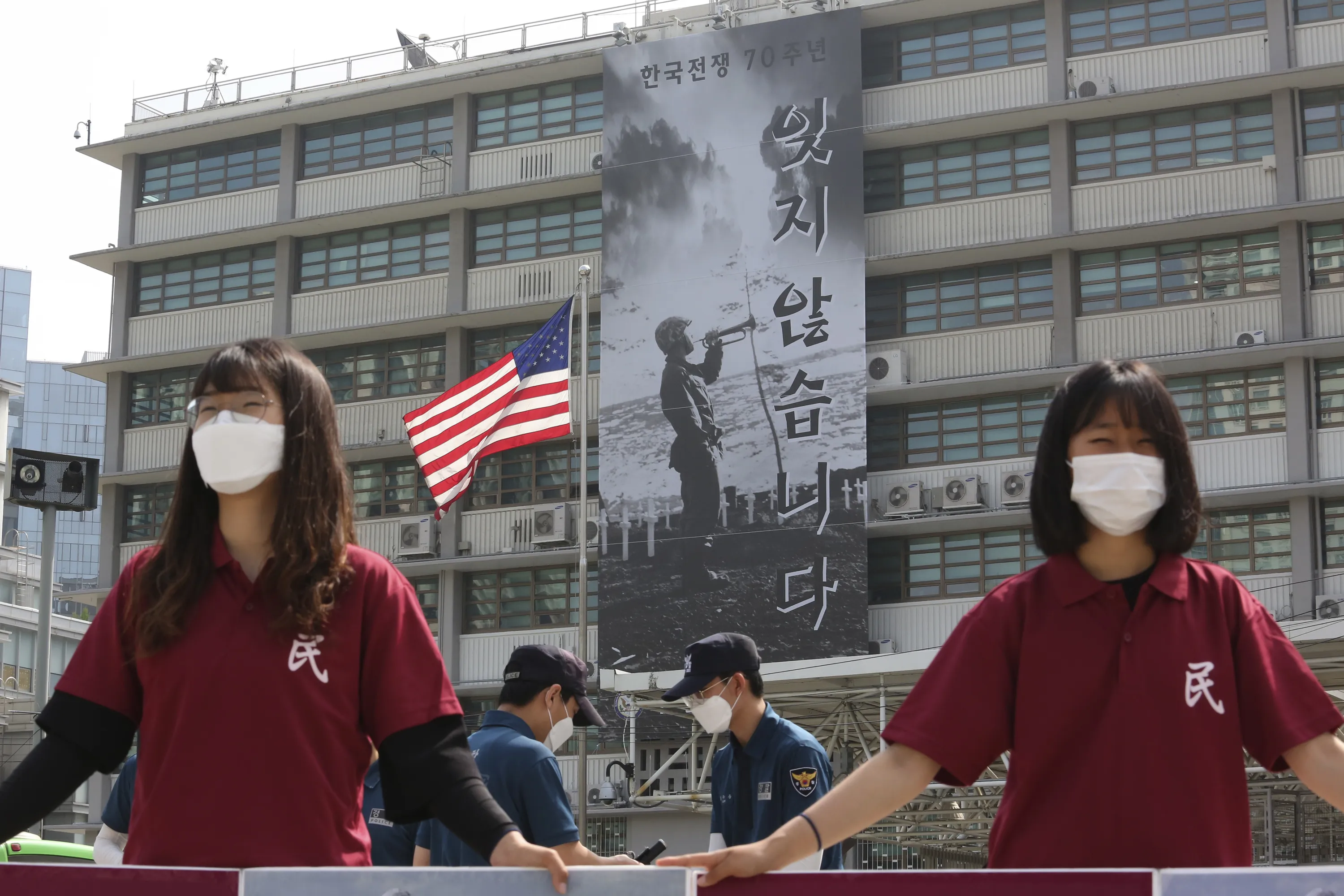 A banner to commemorate the 70th anniversary of the start of the 1950-53 Korean War is displayed after a “Black Lives Matter” banner was taken down, while protesters stage a rally demanding withdrawal of U.S. troops from Korea Peninsula, at the U.S. Embassy in Seoul, South Korea, Tuesday, June 16, 2020. The large Black Lives Matter banner has been removed from the U.S. Embassy building three days after it was raised there in solidarity with protesters back home. The sign reads “Don't forget it”. (Photo by Ahn Young-joon/AP Photo)