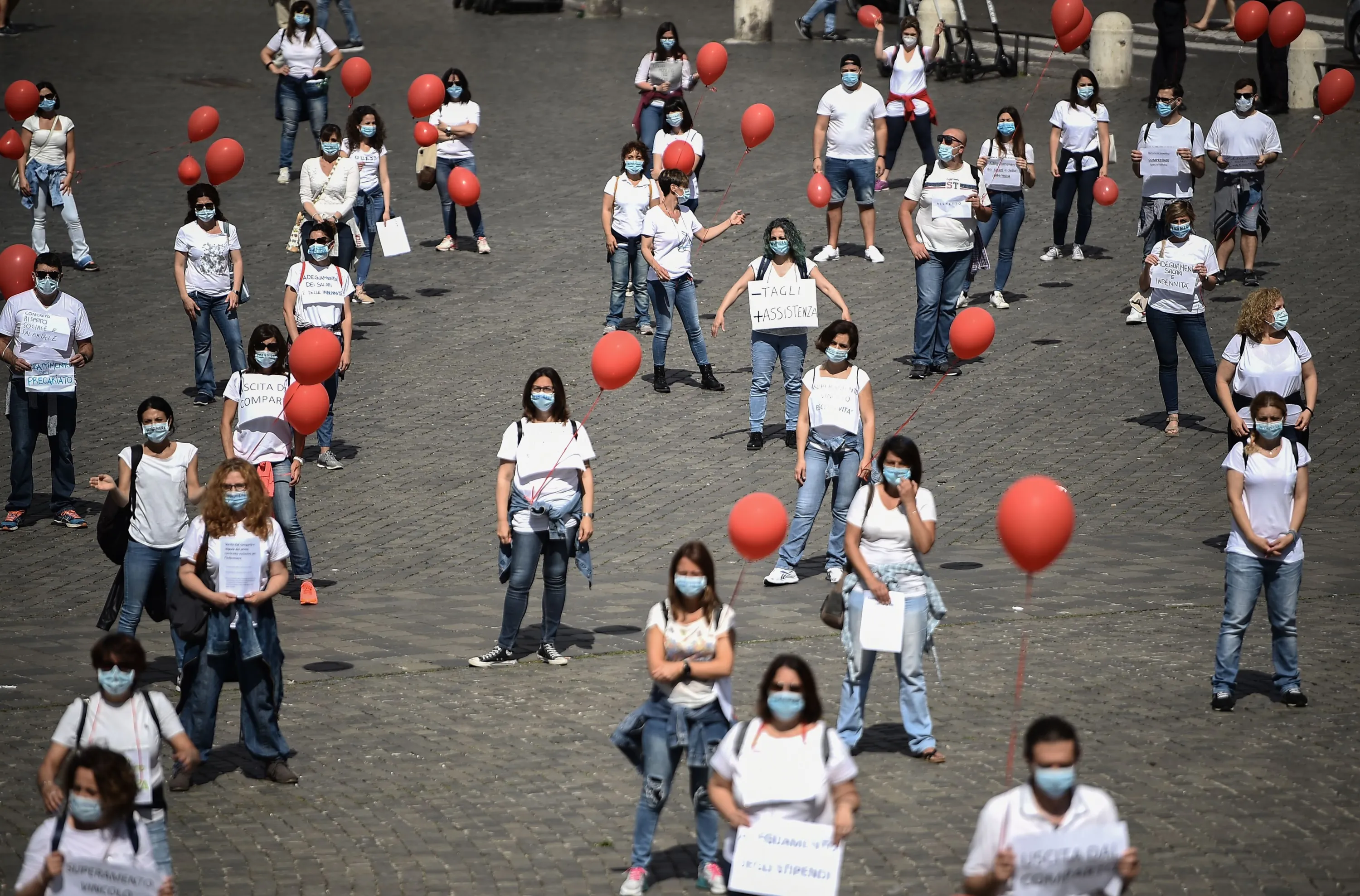 Nurses stage a flashmob protest over contracts, wages, precarious employment and job rights on June 15, 2020 on Piazza del Popolo in Rome, as the country eases its lockdown aimed at curbing the spread of the COVID-19 infection, caused by the novel coronavirus. (Photo by Filippo Monteforte/AFP Photo)