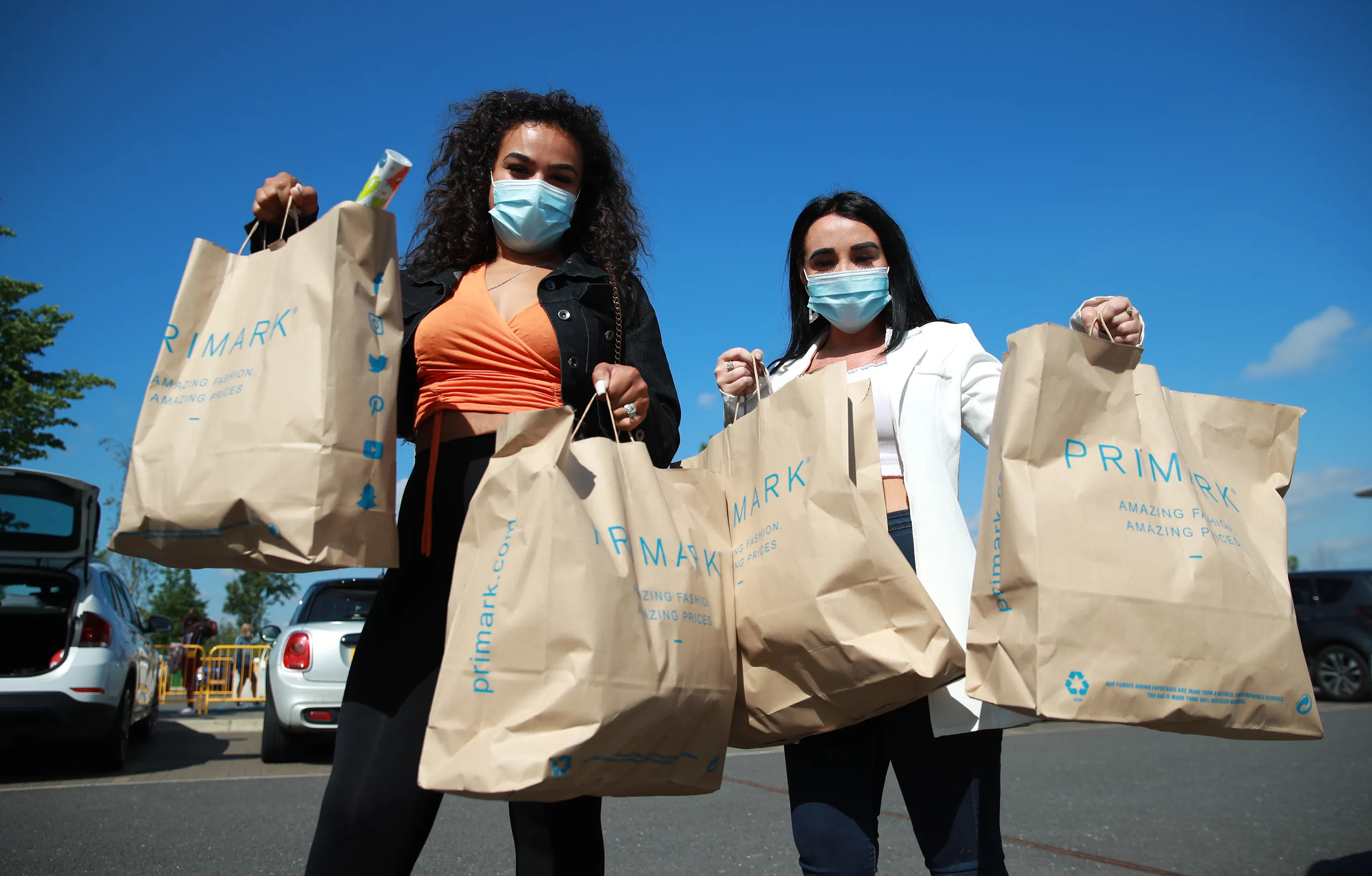 Shoppers carry goods bought at Primark at the Rushden Lakes shopping complex on June 15, 2020 in Rushden, United Kingdom. The British government have relaxed coronavirus lockdown laws significantly from Monday June 15, allowing zoos, safari parks and non-essential shops to open to visitors. Places of worship will allow individual prayers and protective facemasks become mandatory on London Transport. (Photo by David Rogers/Getty Images)