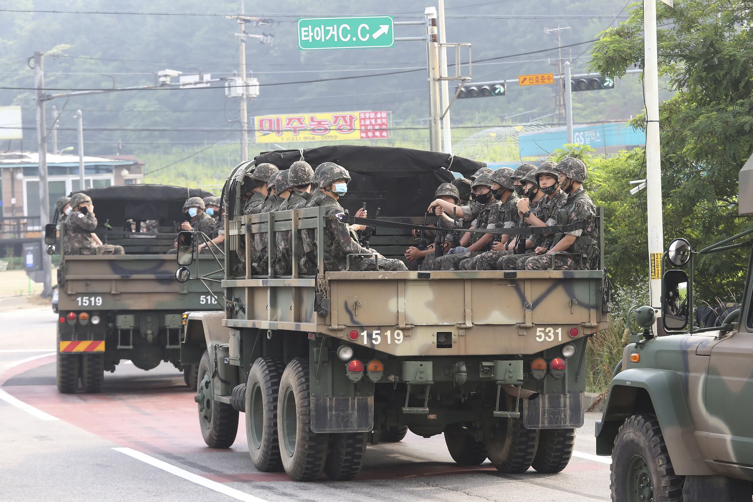 South Korean army soldiers ride on the back of trucks in Paju, near the border with North Korea, South Korea, Wednesday, June 17, 2020. (Photo by Ahn Young-joon/AP Photo)