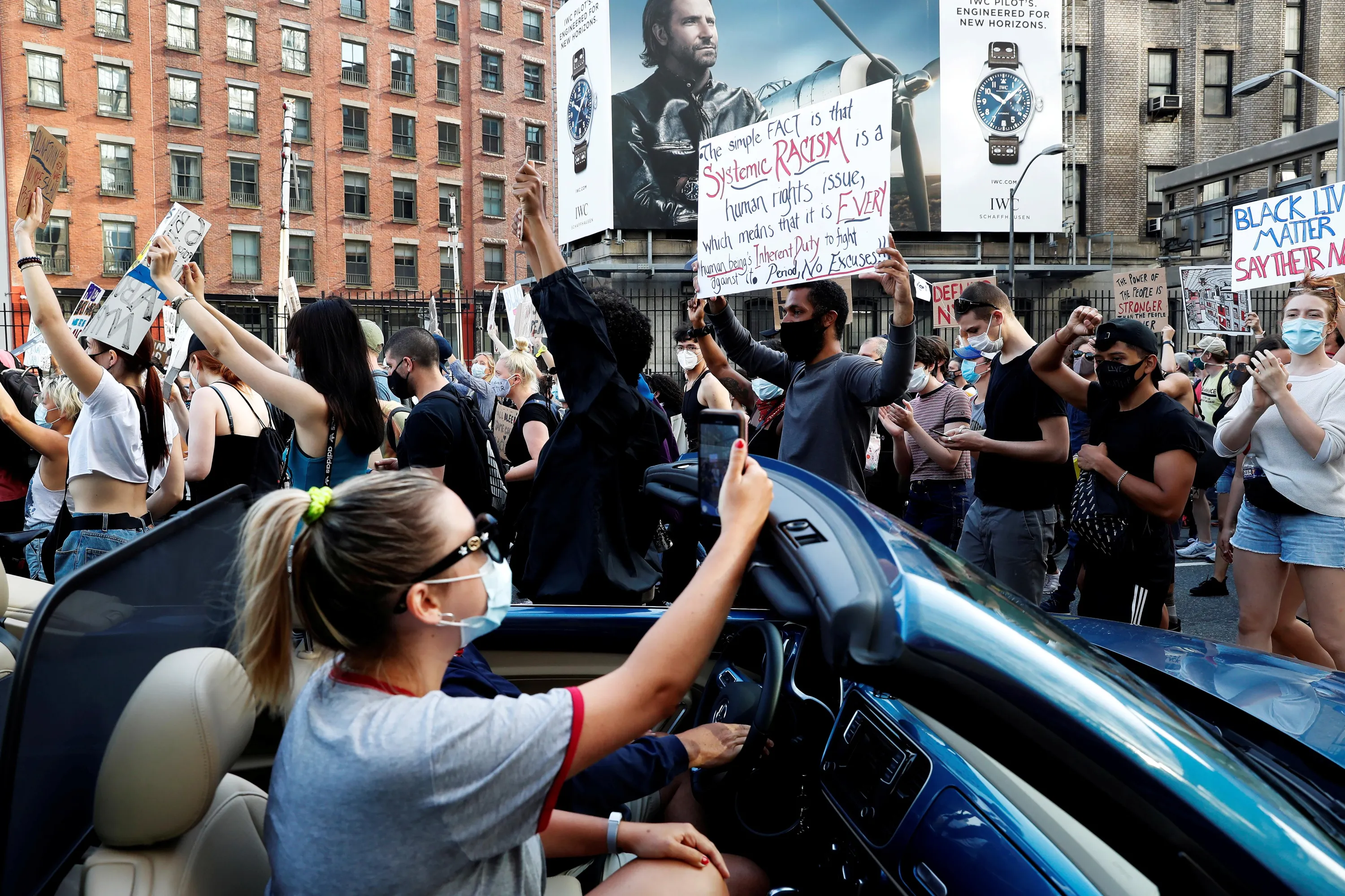 Demonstrators march as cars are stopped during a protest against racial inequality in the aftermath of the death in Minneapolis police custody of George Floyd, in New York, U.S., June 15, 2020. (Photo by Shannon Stapleton/Reuters)